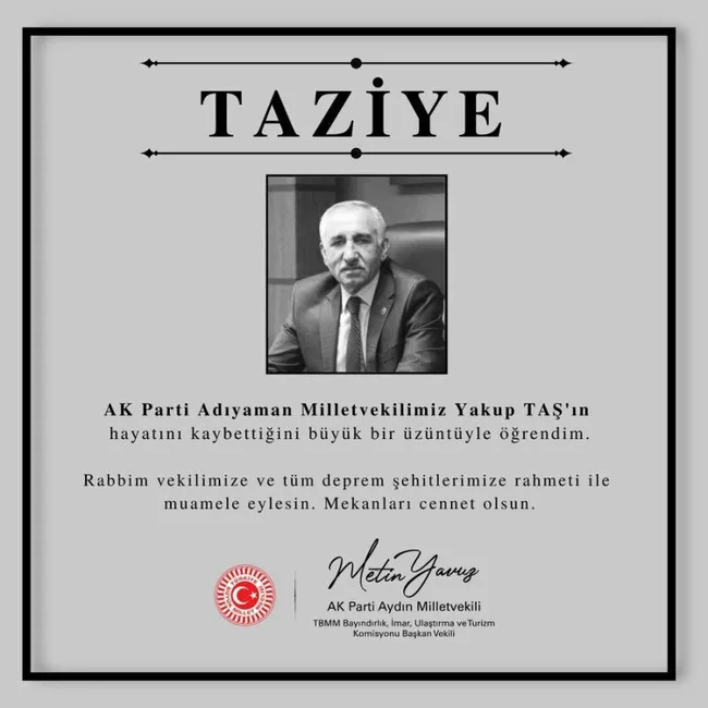 AK Parti Aydın Milletvekili Metin Yavuz, sosyal medya hesabından taziye mesajı yayımladı.
