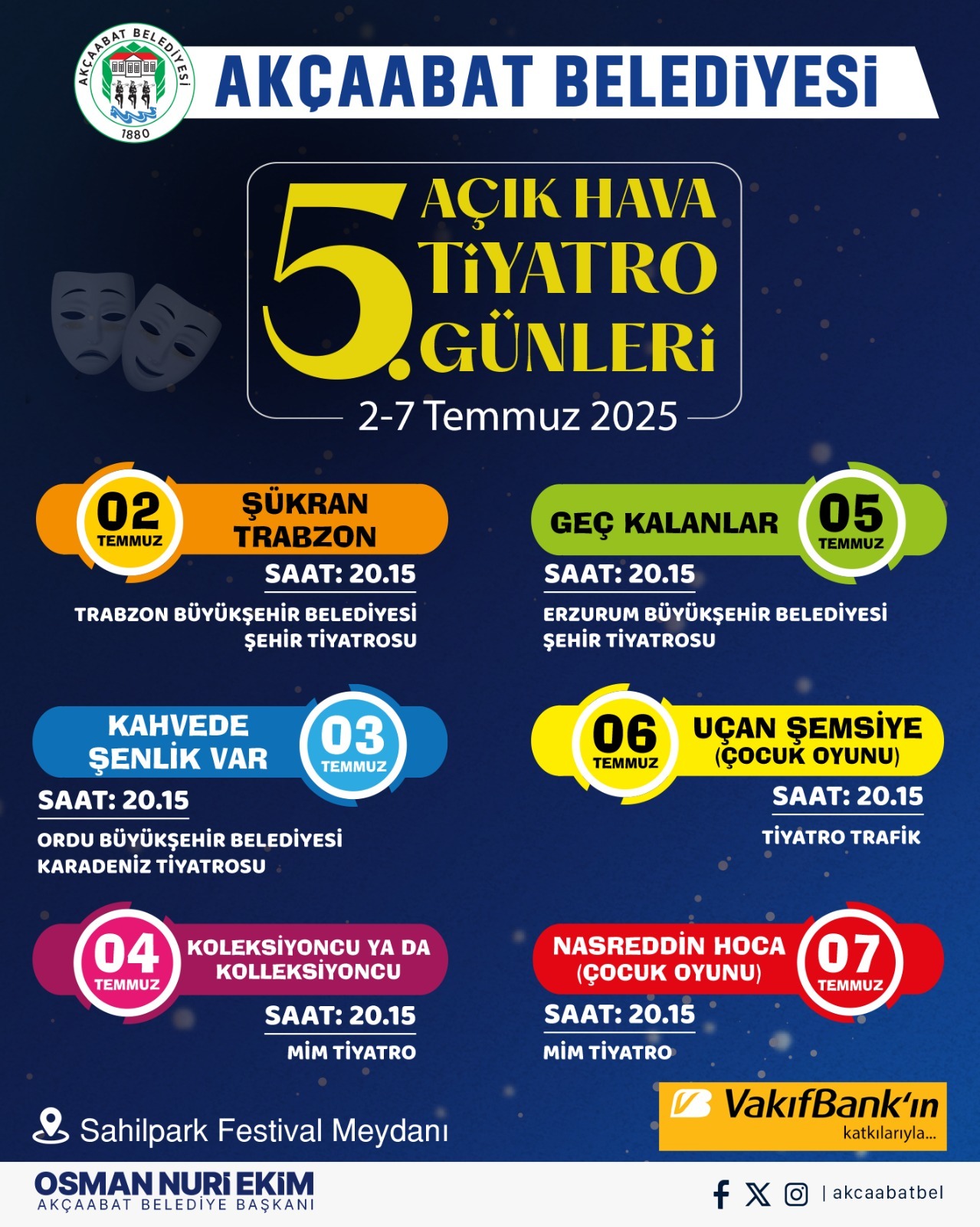 Başkan Osman Nuri Ekim’den Açıklama: “Akçaabat olarak her alanda gelişmeye, güzelleşmeye ve kültürle yoğrulmaya devam ediyoruz. Şehirlerin sadece altyapıyla değil, kültürle de büyüdüğüne inanan bir yönetim anlayışıyla yola çıktık. Bu anlayışın en güzel yansımalarından biri de Açık Hava Tiyatro Günleri’dir.