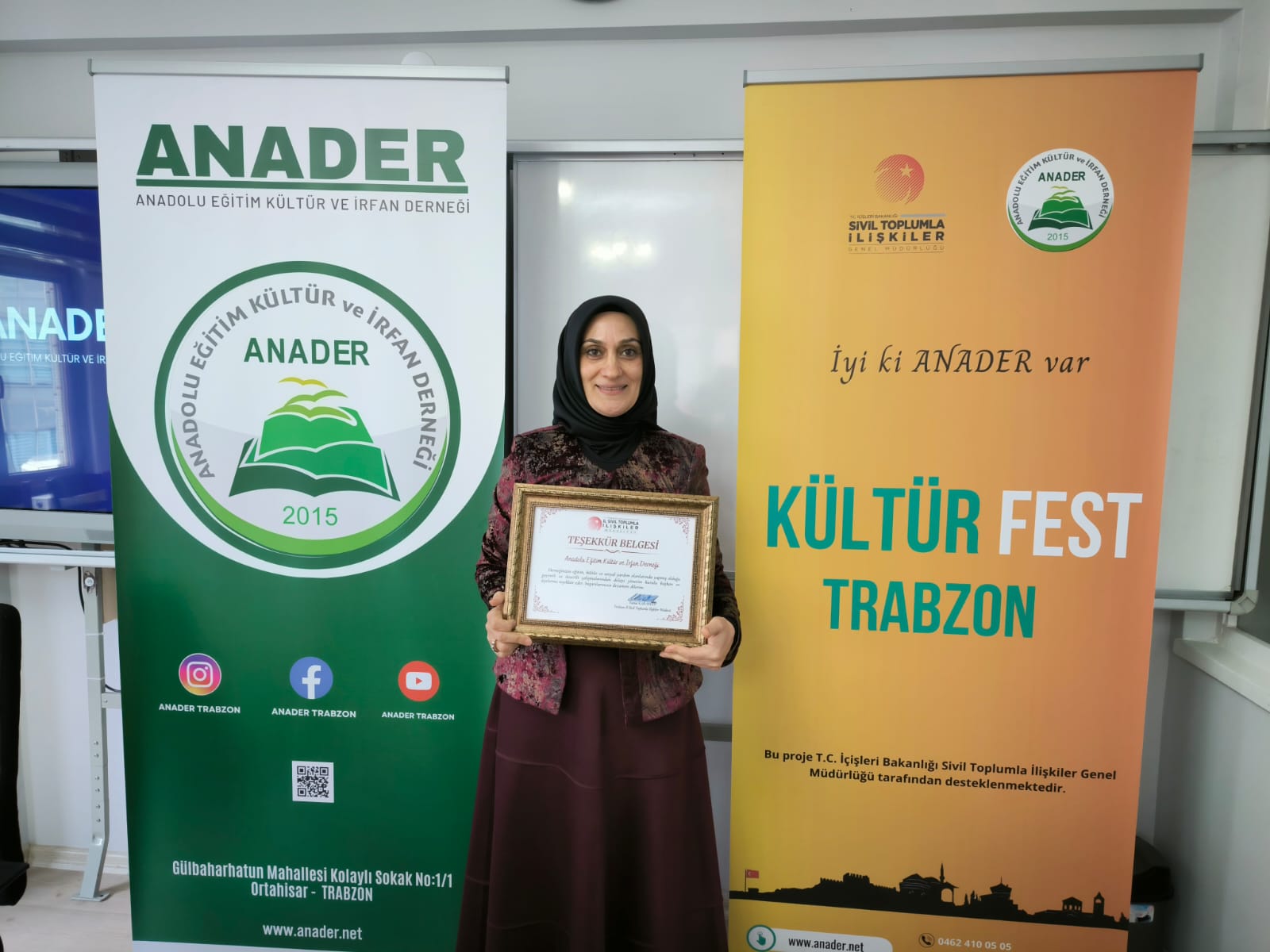 Trabzon’da eğitim, kültür ve sosyal sorumluluk alanlarında gerçekleştirdiği örnek projelerle dikkat çeken Anadolu Eğitim Kültür ve İrfan Derneği (ANADER), Sivil Toplum İlişkiler Genel Müdürlüğü İl Sivil Toplum İlişkiler Müdürlüğü tarafından “Teşekkür Belgesi” ile ödüllendirildi.
