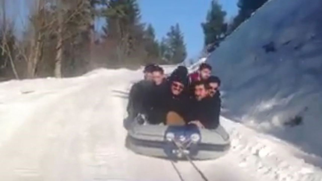 Artvin’de etkili olan kar yağışı sonrası birçok köy beyaz örtüyle kaplandı. Şavşat ilçesine bağlı Kocabey köyünün yolları karla kaplanınca köylüler bunu eğlenceye dönüştürdü. Bir grup arkadaş 4x4 araçların arkasına bağladıkları rafting botu ile kayak yaptı. Rafting botu içerisine oturan 7 arkadaş hızlı giden botla sağa sola savrularak adrenalin yaşadı. Eğlence botun yoldan çıkarak devrilmesiyle son buldu. O anları cep telefonuna kayıt eden grup, sosyal medya hesaplarından paylaşınca görüntüler büyük ilgi gördü.