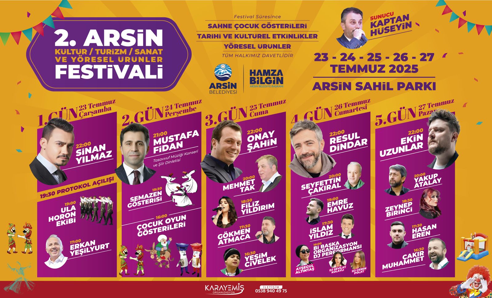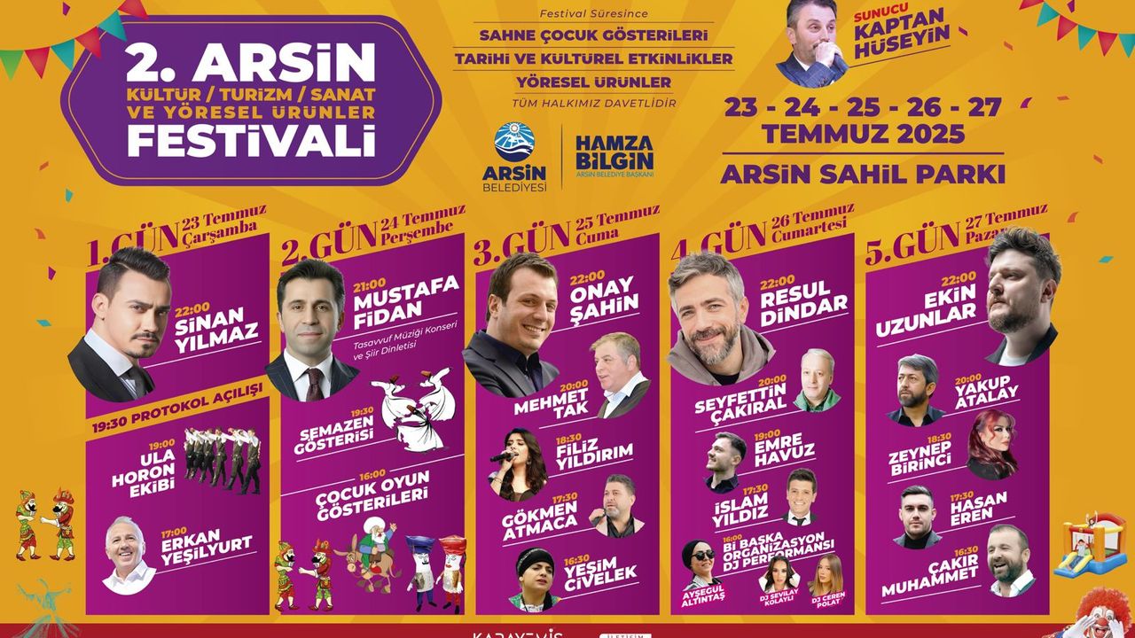 Arsin Belediyesi öncülüğünde ve sponsorların desteğiyle düzenlenen 2. Arsin Kültür, Turizm, Sanat ve Yöresel Ürünler Festivali, yarın başlıyor. 23-27 Temmuz tarihleri arasında Arsin Sahil Parkı’nda gerçekleşecek festival, beş gün boyunca dopdolu bir programla ziyaretçilerini ağırlayacak.