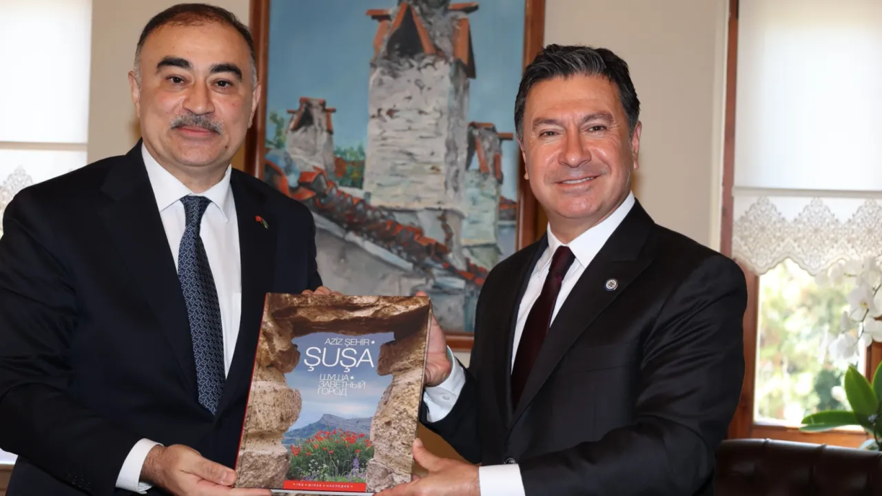 Muğla Büyükşehir Belediye Başkanı Ahmet Aras, Azerbaycan Cumhuriyeti Ankara Büyükelçisi Reşad Memmedov’u makamında ağırladı. İki ülke arasındaki dostluk ilişkileri, kültürel iş birlikleri ve yerel yönetim düzeyindeki iş birliği olanakları ele alındı.MUĞLA (İGFA) - Büyükelçi Reşad Memmedov’a ziyaret sırasında Azerbaycan Cumhuriyeti Büyükelçiliği Müsteşarı ve Misyon Şefi Yardımcısı Eldar Aliyev ile Perviz Memmedov da eşlik etti. Ziyarette, Muğla ile Azerbaycan kentleri arasında kardeş şehir ilişkileri kurulması, kültürel ve turistik etkileşimin artırılması gibi başlıklar gündeme geldi.