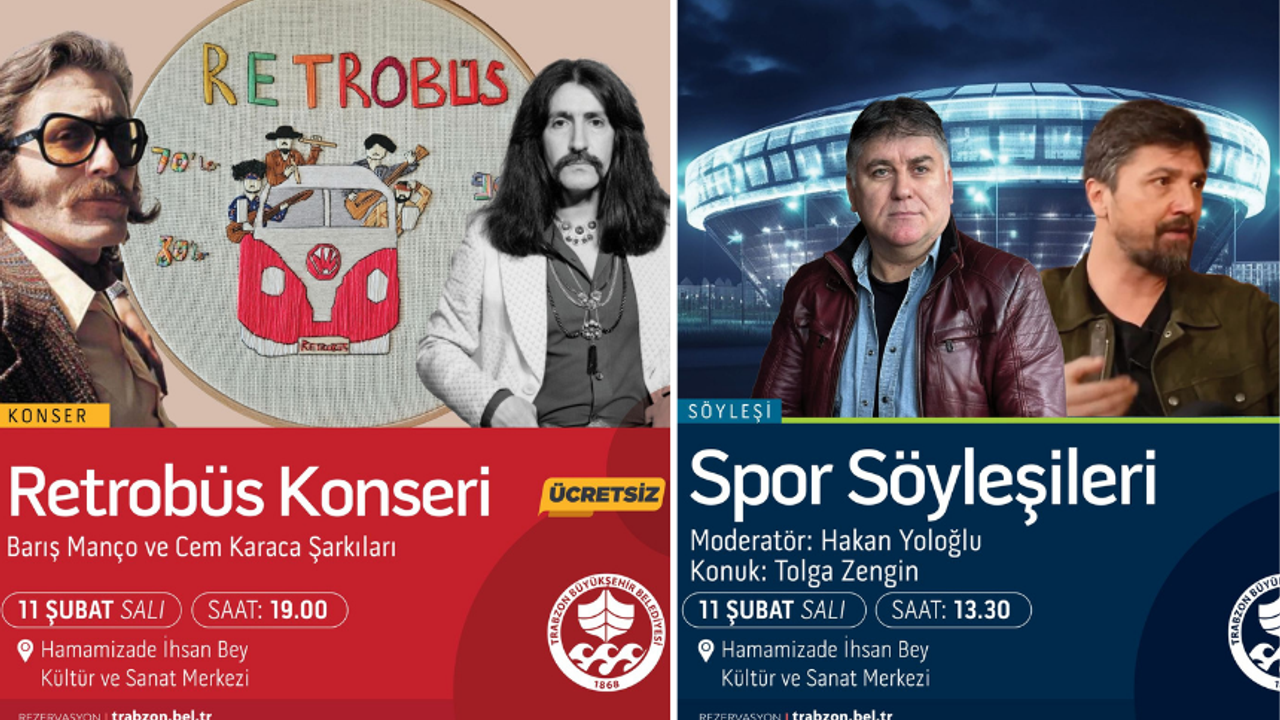 Trabzon Büyükşehir Belediyesi, kültür ve sanat alanındaki etkinliklerine hız kesmeden devam ediyor. Hamamizade İhsan Bey Kültür ve Sanat Merkezi’nde her ay düzenlenen ve birbirinden renkli programlarla vatandaşları bir araya getiren etkinlikler, şehrin sanat ve kültür hayatına katkı sunuyor. Bu kapsamda yarın (11 Şubat Salı) iki önemli etkinlik gerçekleştirilecek. İlk olarak Trabzonspor’un efsane kalecisi Tolga Zengin, saat 13.30’da sevenleriyle bir araya gelecek. Hakan Yoloğlu’nun moderatörlüğünde gerçekleşecek olan söyleşide Tolga Zengin, kariyerinden unutulmaz anılarını paylaşacak, futbol dünyasına dair deneyimlerini aktaracak ve katılımcıların sorularını yanıtlayacak. Saat 19.00’da ise Barış Manço ve Cem Karaca’nın unutulmaz şarkılarından oluşan Retrobüs Konseri müzikseverlere keyifli bir akşam yaşatacak. Trabzon Büyükşehir Belediyesi'nden yapılan açıklamada, bütün vatandaşlar ücretsiz olan bu etkinliklere davet edildi.