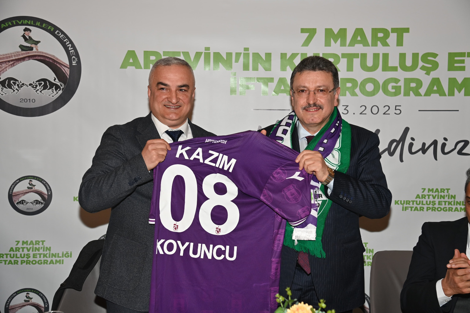Başkan Genç, “Trabzon'da bir aileyiz. Bu bölgenin, bu toprakların insanlarıyız. Trabzon'umuzda daha ileri donanıma sahip hastane kuruluşları olması hasebiyle şehrimize Artvin'den, Rize'den, Gümüşhane'den ve Bayburt'tan gelen komşularımız var. Onların refakatçi konukevi ihtiyacı var. Bunun sözünü seçimden önce vermiştim. Kısa vadede hayata geçirmek için gayret ediyoruz. Ben bu vesileyle tekrar Ramazan ayınızı tebrik ediyorum” diye konuştu. Artvinliler Derneği Başkanı Ahmet Külekçi, Başkan Genç’e Kazım Koyuncu’nun ailesinin hediyesi olan forma takdim etti. Başkan Genç de çiçek verdiği kadın katılımcıların 8 Mart Dünya Kadınlar Günü’nü kutladı.