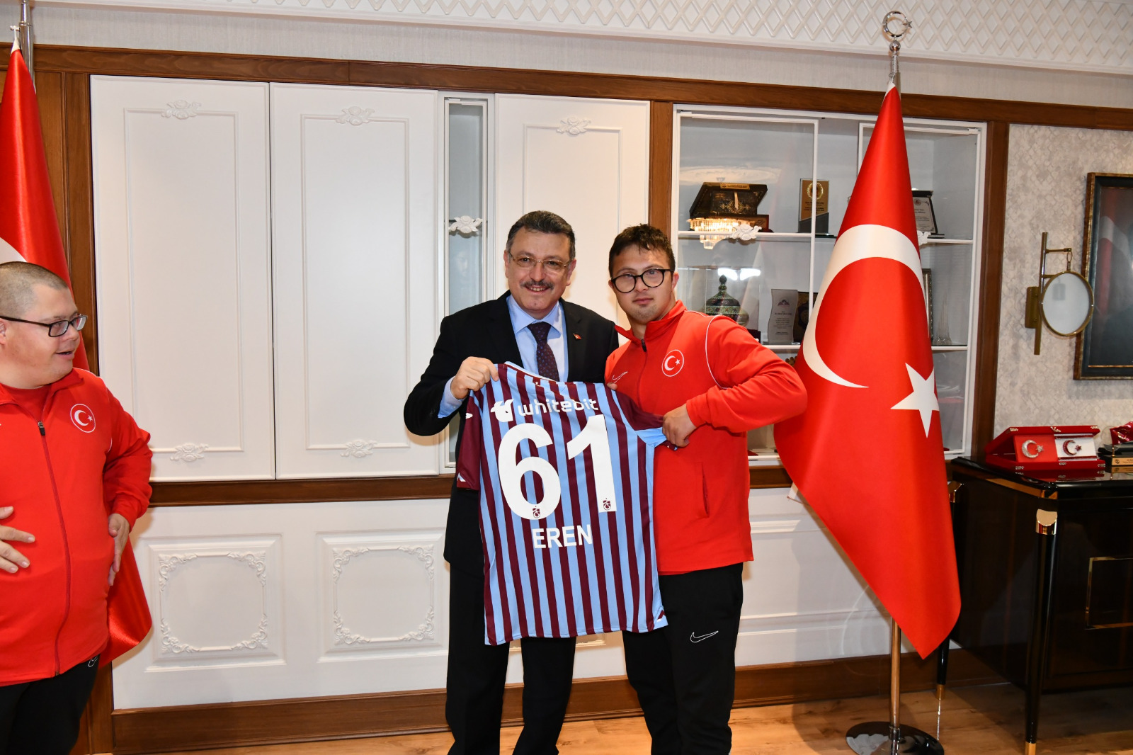 Ziyaretin en renkli anlarından biri ise Rizeli milli sporcu Eren Akcanca’ya özel olarak hazırlanan, isminin yazılı olduğu Trabzonspor forması hediye edilmesi oldu. Fanatik bir Trabzonspor taraftarı olan Eren’in yaşadığı mutluluk salona neşe kattı.