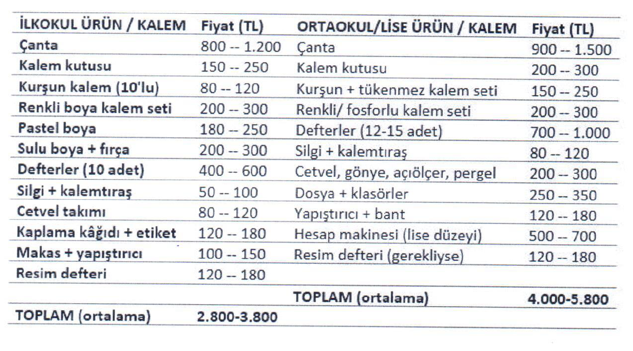 BİR ÖĞRENCİNİN OKUL ÇANTASI KAÇ LİRAYA DOLUYOR?
