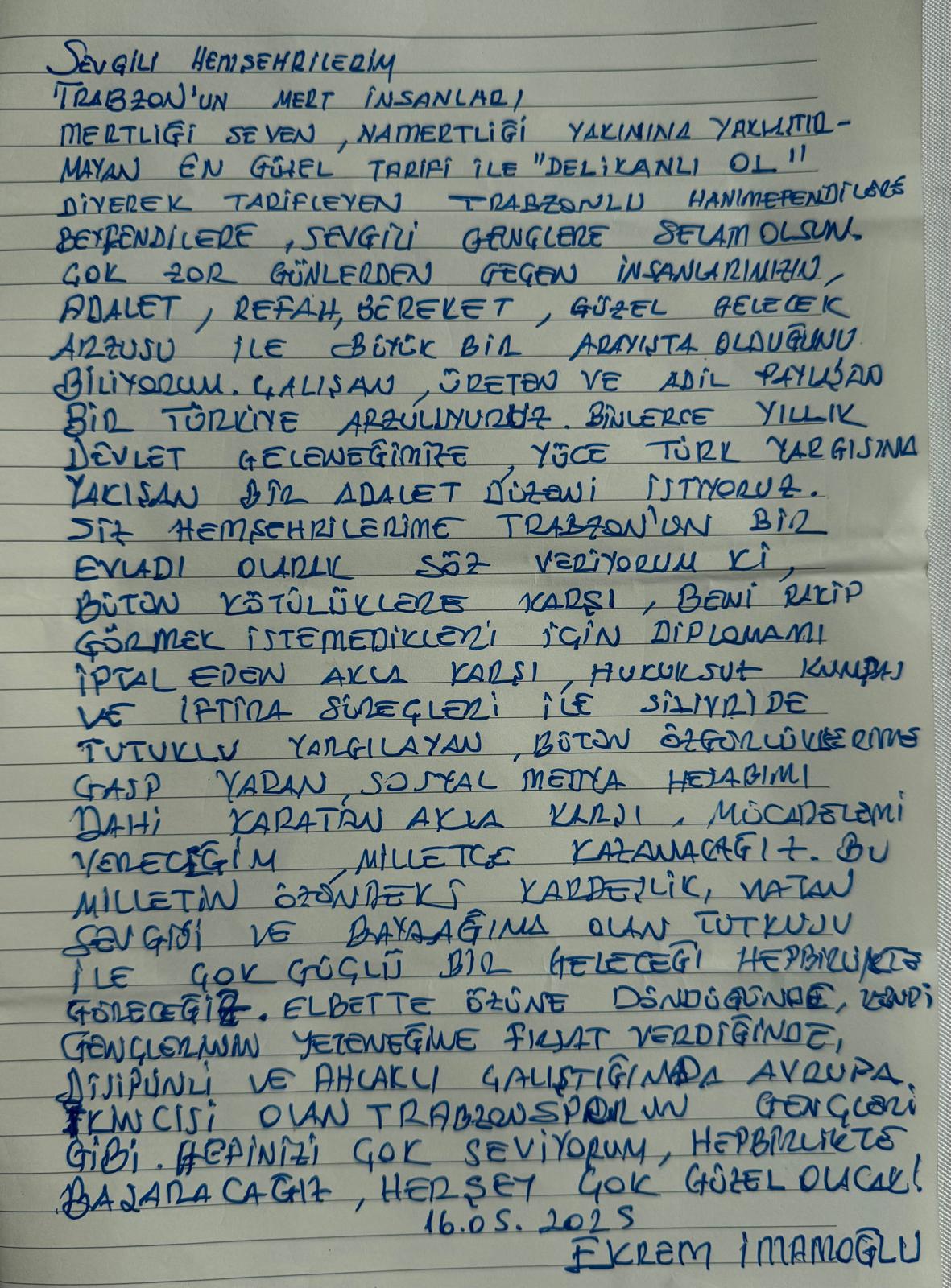 “Sevgili hemşerilerim, Trabzon’un mert insanları! Mertliği seven, namertliği yakınına yaklaştırmayan, en güzel tarifi ile ‘Delikanlı ol!’ diyerek kendini tarifleyen Trabzonlu hanımefendilere, beyefendilere, sevgili gençlere selam olsun. Çok zor günlerden geçen insanlarımızın adalet, refah, bereket, güzel gelecek arzusu ile büyük bir arayışta olduğunu biliyorum. Çalışan, üreten ve adil paylaşan bir Türkiye arzusundayız. Binlerce yıllık devlet geleneğimizde, yüce Türk yargısına yakışan bir adalet düzeni istiyoruz. Siz hemşerilerime Trabzon’un bir evladı olarak söz veriyorum ki; bütün kötülüklere karşı, beni rakip görmek istemedikleri için diplomamı iptal eden akla karşı, hukuksuz kumpas ve iftira süreçleri ile Silivri’de tutuklu yargılayan, bütün özgürlüklerime gasp yapan, sosyal medya hesabımı kapatan akla karşı, mücadelemi vereceğim. Milletçe kazanacağız. Bu milletin özündeki kardeşlik, vatan sevgisi ve bayrağına olan tutkusu ile çok güçlü geleceği hep birlikte göreceğiz. Elbette özüne döndüğünde, kendi gençlerinin yeteneğine fırsat verdiğinde, disiplinli ve ahlaklı çalıştığında Avrupa ikincisi olan Trabzonspor’un gençliği gibi. Hepinizi çok seviyorum hep birlikte başaracağız. Her şey çok güzel olacak!”