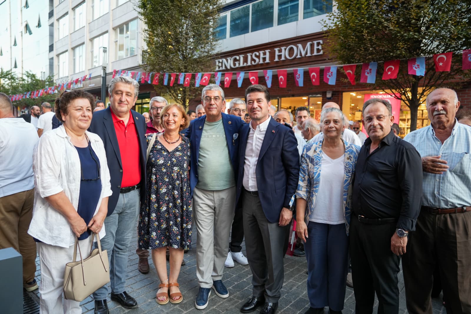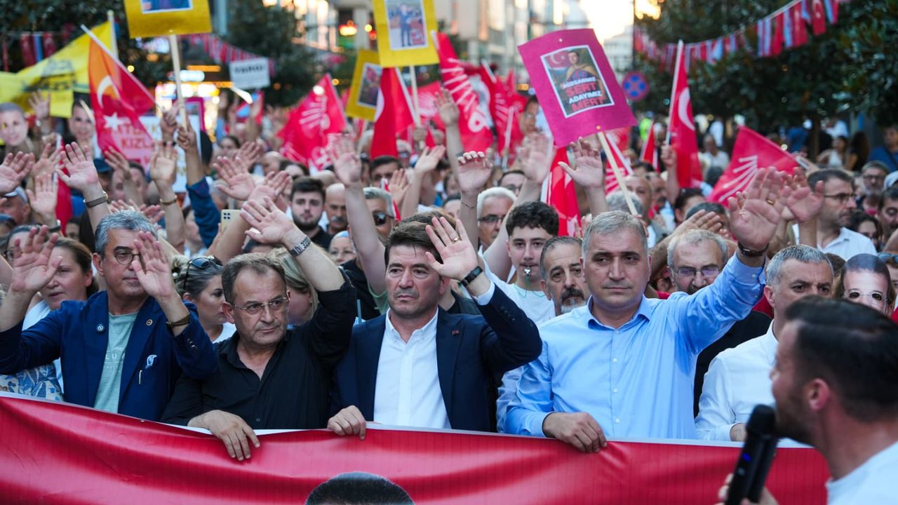 CHP Gençlik Kolları üyeleri, 19 Mart operasyonlarında tutuklanan belediye başkanlarının fotoğraflarını taşıyarak alanda özgürlük çağrısı yaptı. Katılımcılar, “Hak, hukuk, adalet”, “Direne direne kazanacağız” ve “Cumhurbaşkanı İmamoğlu” sloganları attı.