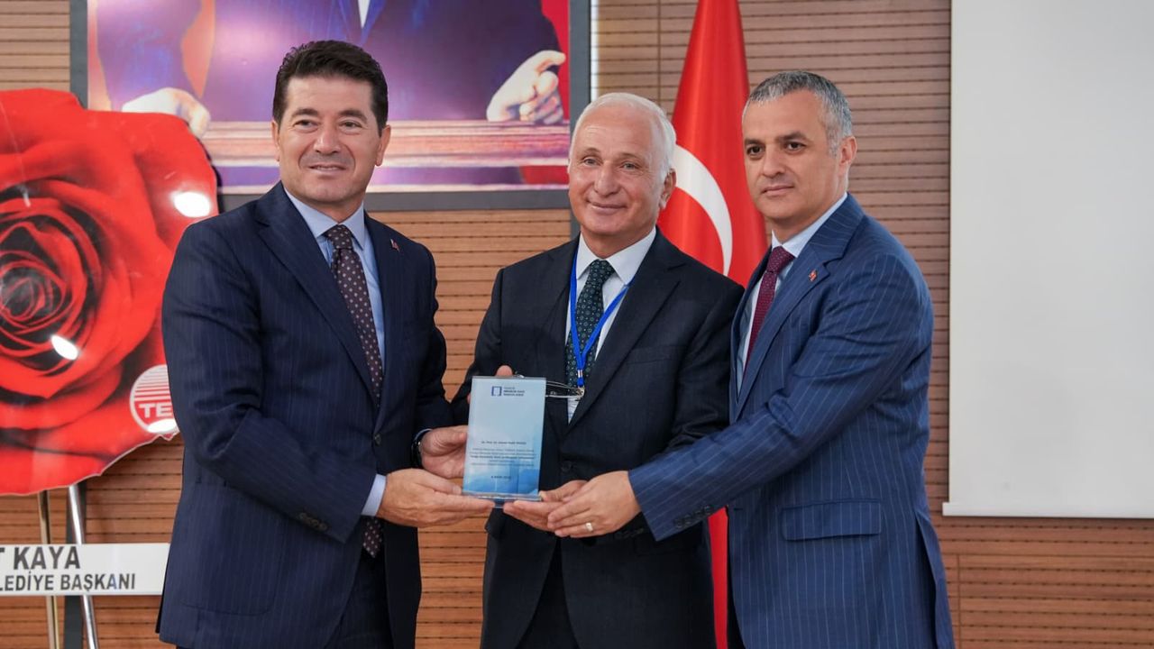 KTÜ Mimarlık Fakültesi Şehircilik Anabilim Dalı Başkanı Prof. Dr. Ahmet Melik Öksüz’ün ‘Geçmişten Günümüze Doğu Karadeniz Kentleri’ konulu sunumunu dinleyen Başkan Kaya, Prof. Dr. Öksüz’e plaket verdi.