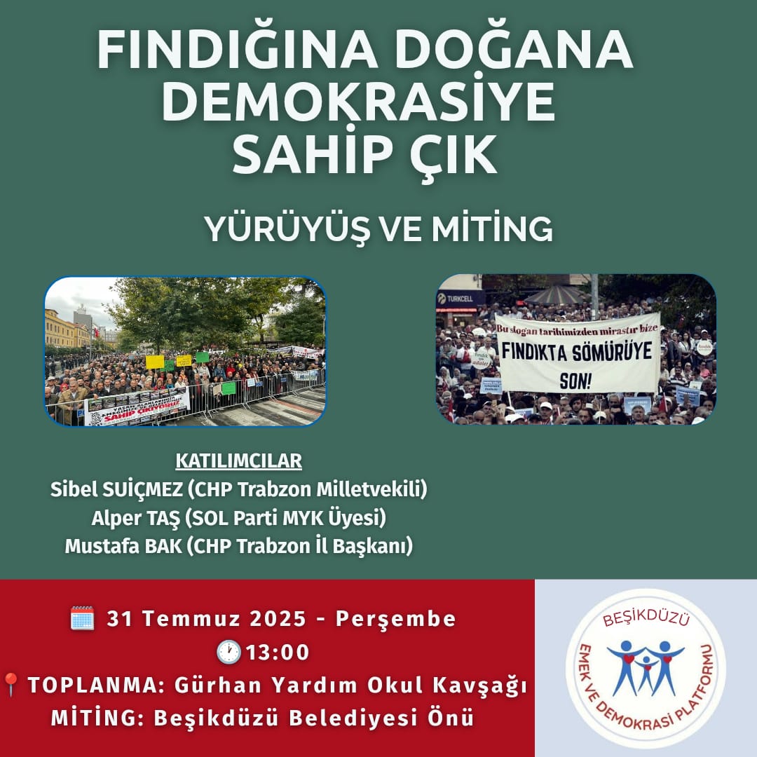 Mitingde, üreticilerin fındık taban fiyatı olarak 250 TL talebi dile getirilecek ve bu fiyatın altında alım yapılmaması gerektiği vurgulanacak. Ayrıca, doğa ve yaşam alanlarını tehdit eden maden ve enerji projelerine karşı kamuoyu oluşturulması hedefleniyor.