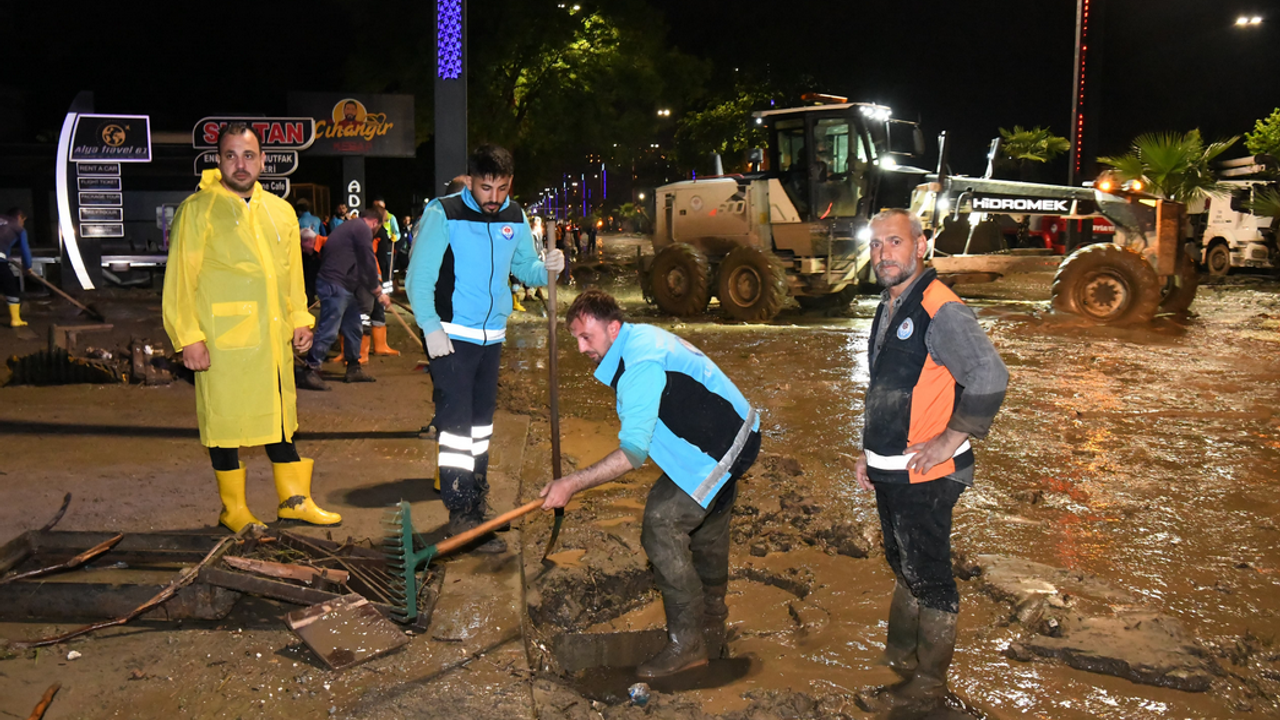 Trabzon'da sabah saatlerinde etkili olan şiddetli yağışın yol açtığı sel ve su baskınlarından etkilenen Beşirli ve Moloz'da çamur temizleme çalışmaları sabaha kadar devam etti. Şehrin en hareketli bölgeleri olan iki noktada selin getirdiği çamur birikintilerinin temizlenmesi için yoğun çaba harcayan Büyükşehir Belediyesi ekiplerinin çalışmalarının sabaha kadar süreceği açıklandı. Caddeler, yaya kaldırımları ve su baskınına uğrayan iş yerlerindeki çamur birikintilerinin temizlenmesi için yoğun bir çalışma yürütüldüğünü belirten Büyükşehir Belediye Başkan Vekili Faruk Kanca, "Başkanımız Ahmet Metin Genç’in talimatları doğrultusunda bütün ekiplerimizi, sel ve su baskınlarından en çok etkilenen Moloz ve Beşirli semtlerimize yönlendirdik. 184 personel ve 165 araç ile çalışmalarımız sürüyor. Yeni günün ilk ışıklarıyla birlikte hayatı normale döndürmeyi, yaya kaldırımlarımızı sel artıklarından tamamen temizleyi ve esnaflarımızın dükkanlarını sorunsuz olarak açabilmelerini sağlamayı hedefliyoruz" dedi.
