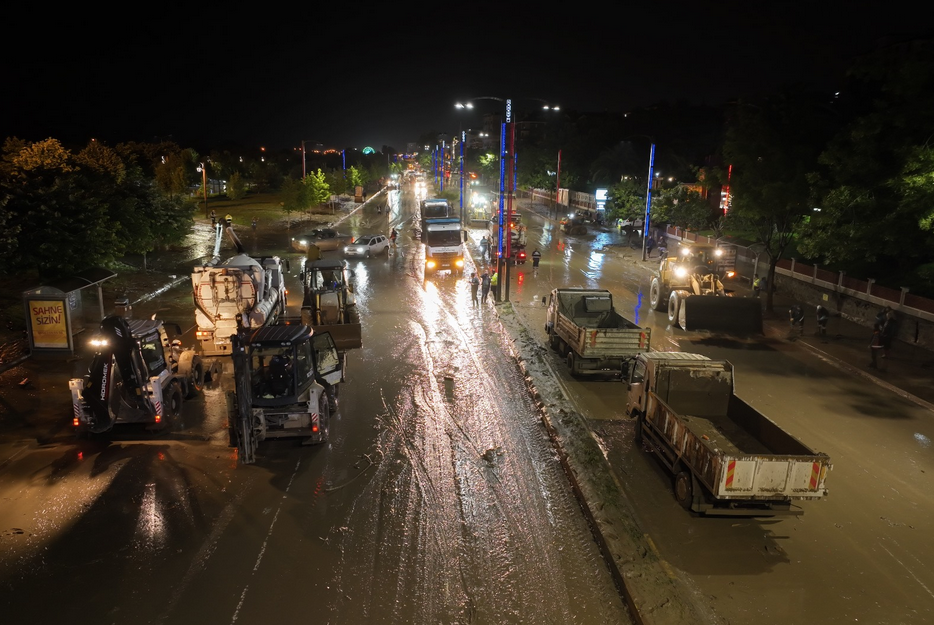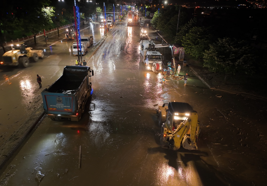 Trabzon'da bu sabah etkili olan şiddetli yağış nedeniyle oluşan sel ve su taşkınlarının meydana getirdiği olumsuzluklara müdahale sürüyor. Büyükşehir Belediyesi ekipleri, sel sularının getirdiği çamurları temizleyerek gün ağardığında her iki bölgede hayatı normale döndürmek için büyük gayret sarf ediyor.