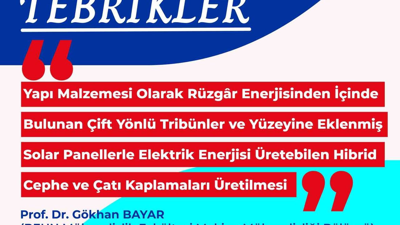 Zonguldak Bülent Ecevit Üniversitesi (BEUN) Mühendislik Fakültesi Makine Mühendisliği Bölümü Öğretim Üyesi Prof. Dr. Gökhan Bayar’ın buluş sahibi olduğu "Yapı Malzemesi Olarak Rüzgâr Enerjisinden İçinde Bulunan Çift Yönlü Tribünler ve Yüzeyine Eklenmiş Solar Panellerle Elektrik Enerjisi Üretebilen Hibrid Cephe ve Çatı Kaplamaları Üretilmesi" başlıklı faydalı model başvurusu tescil belgesi almaya hak kazandı.