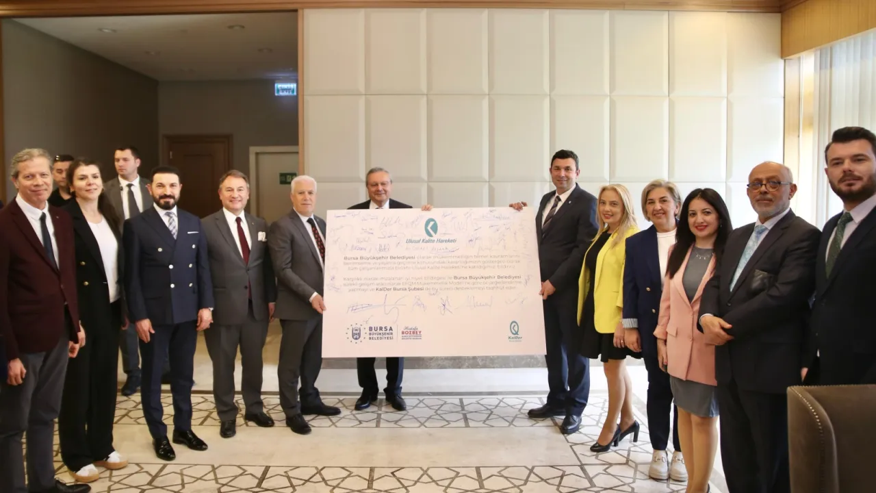 Kurumların uzun vadeli başarısını destekleyen stratejik bir yönetim sistemi olan EFQM modelini, Bursa Büyükşehir Belediyesi’nin benimsediğini ve yaşama geçireceğini simgeleyen Ulusal Kalite Hareketi İyi Niyet Bildirgesi, Bursa Büyükşehir Belediye Başkanı Mustafa Bozbey ve KalDer Bursa Şubesi Yönetim Kurulu Başkanı Serkan Ürkmez arasında imzalandı.BURSA (İGFA) - Bursa’da kalite odaklı belediyecilik anlayışıyla hizmetlerini sürdüren Büyükşehir Belediyesi, kurum kültürünü mükemmellik ekseninde geliştirmek ve Bursa’yı daha yaşanabilir, daha sürdürülebilir bir kent haline getirmek amacıyla önemli bir adım attı.