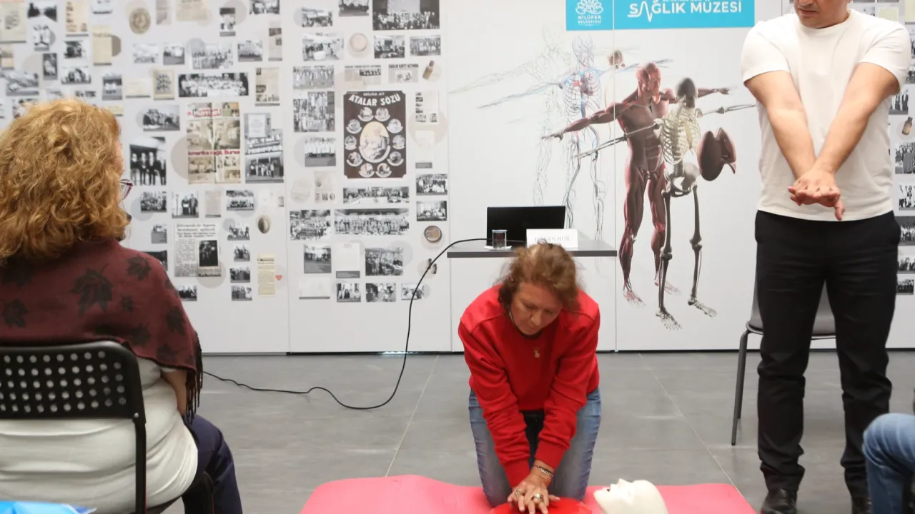 Bursa Nilüfer Belediyesi Dr. Ceyhun İrgil Sağlık Müzesi’nde gerçekleşen etkinlikte, İş Güvenliği ve İlk Yardım Uzmanı Hasan Hür, doğru ilk yardım müdahaleleri hakkında bilgi vererek, uygulamalı olarak gösterdi.BURSA (İGFA) - Bursa Nilüfer Belediyesi’nin Dr. Ceyhun İrgil Sağlık Müzesi’nde düzenlediği “Sağlık Buluşmaları”, “1-7 Mayıs Trafik ve İlk Yardım Haftası” kapsamında gerçekleştirilen etkinlikle devam etti. Programa, Nilüfer Nur-Hayati Kurtcan Mesleki ve Teknik Anadolu Lisesi öğrencileri ile vatandaşlar katıldı.