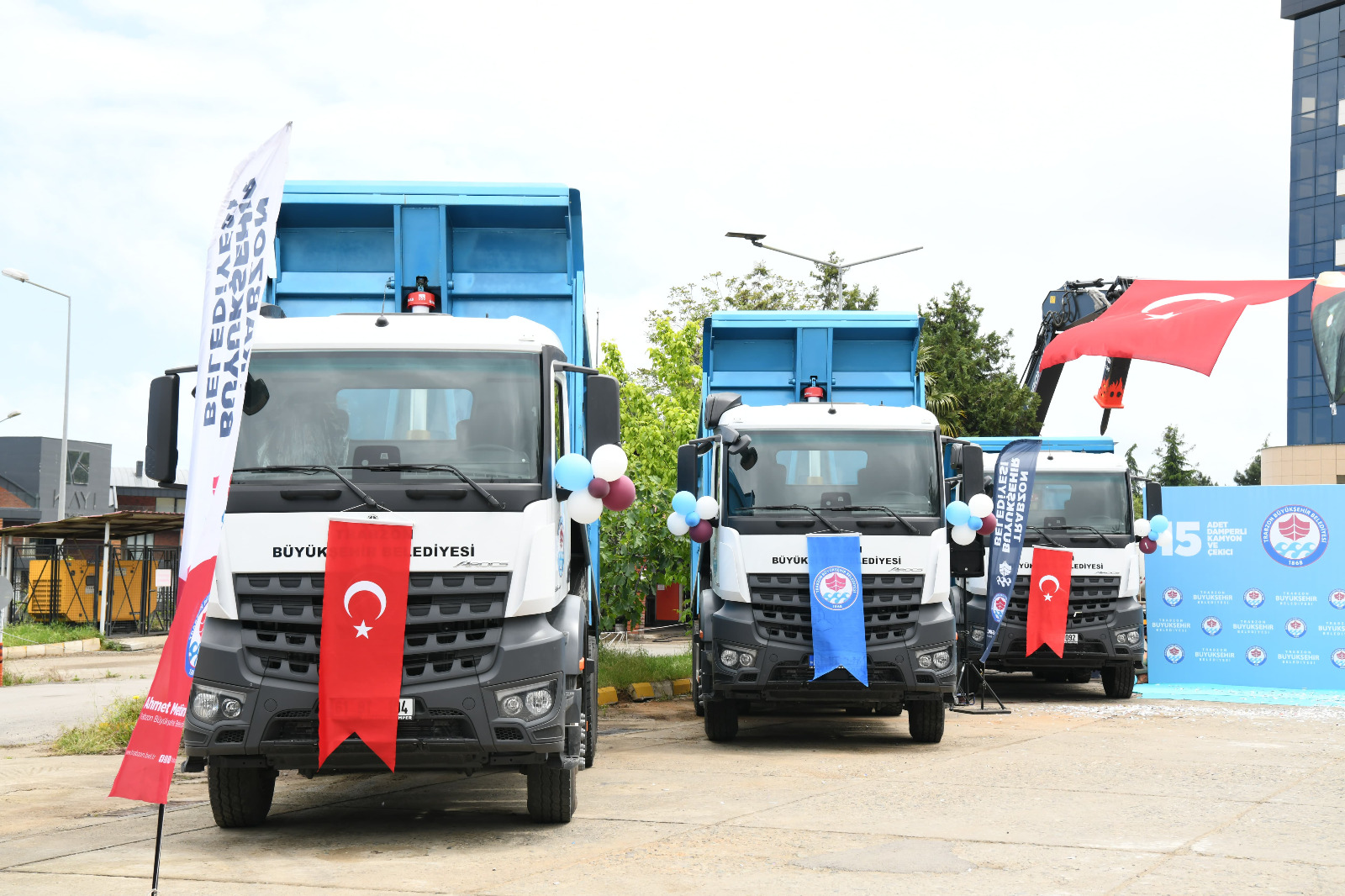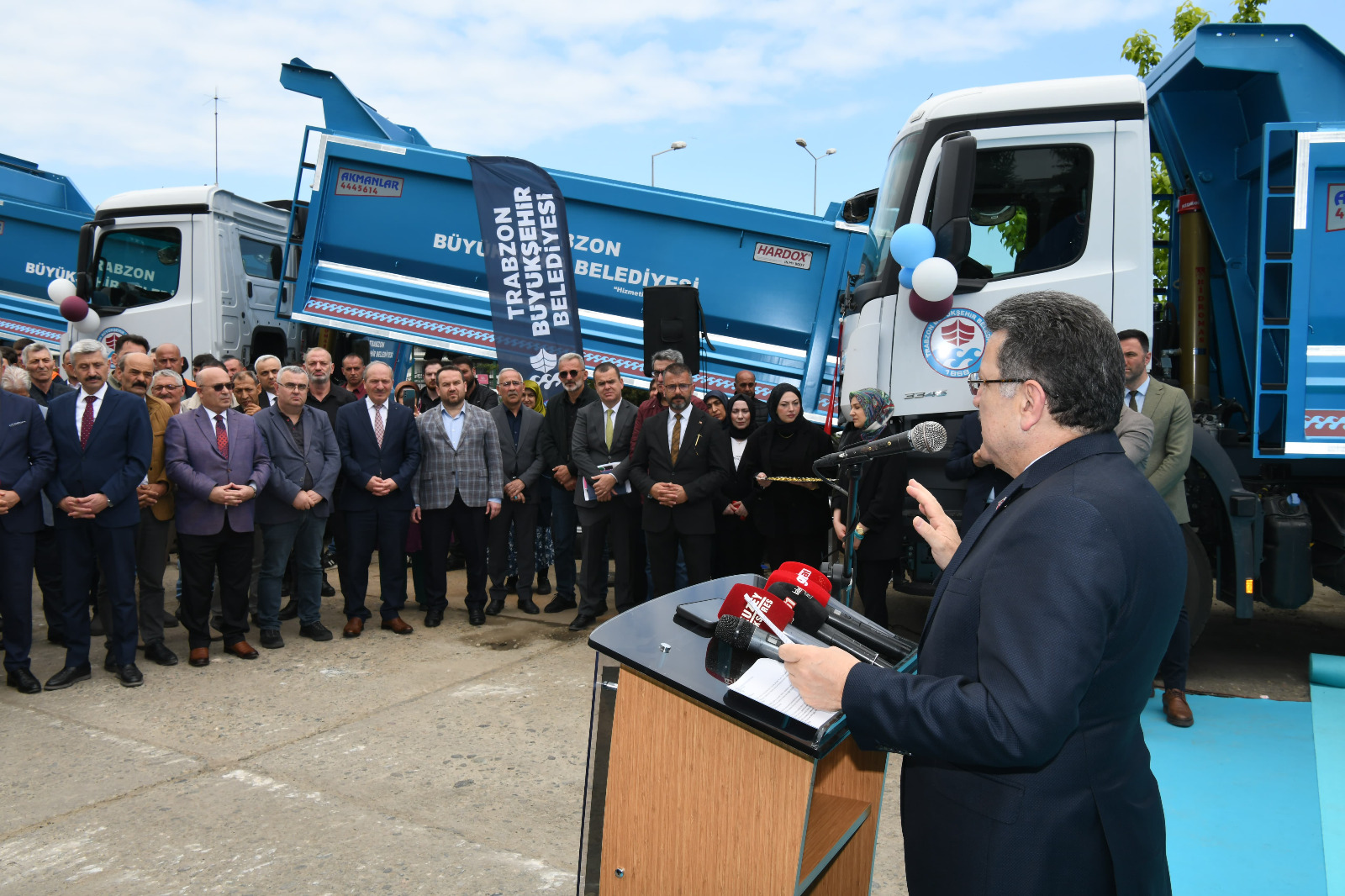 Trabzon Büyükşehir Belediyesi filosuna kazandırılan 13 kamyon ve 2 çekici TIR, Büyükşehir Belediye Başkanı Ahmet Metin Genç’in katıldığı törenle hizmete alındı. Törene, Milliyetçi Hareket Partisi Trabzon İl Başkanı Tolgay Sivrikaya, Araklı Belediye Başkanı Hüseyin Avni Coşkun Çebi, Arsin Belediye Başkanı Hamza Bilgin, Köprübaşı Belediye Başkanı Ali Aydın, AK Parti Ortahisar İlçe Başkanı Seyit Hisoğlu, AK Parti İl Kadın Kolları Başkanı Ayfer Cihan, Hassoy Motorlu Vasıtalar Genel Müdürü Selim Saral, belediye meclis üyeleri, muhtarlar ve belediye çalışanları katıldı. Başkan Ahmet Metin Genç, “İlçelerimizde ve mahallelerimizde hizmet yolculuğunu sürdürüyoruz. Trabzon’umuz engebeli bir arazi yapısına sahip. Şehrimizde şu anda 22 bin kilometre yol ağımız var. Çok ciddi bir yol ağı. Bu yol ağının 2 bin kilometresi Karayolları ağında. Geri kalan 21 bin kilometreye yakın kısmı ise Büyükşehir ve ilçe belediyelerimizin yol ağındadır. Dolayısıyla böyle bir sorumluluk sahasında çalışmalarımızı sürdürüyoruz” dedi.
