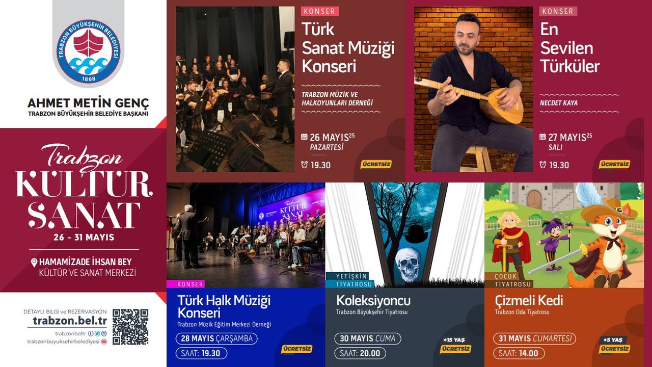 Mayıs ayının son tiyatro gösterileri de oldukça renkli geçecek. 30 Mayıs Cuma günü saat 20.00’de sahnelenecek olan “Koleksiyoncu” adlı oyun, tiyatro severlere sürükleyici bir performans sunacak. Ardından, 31 Mayıs Cumartesi günü saat 14.00’te tekrar sahnelenecek olan çocuk oyunu “Çizmeli Kedi”, minik izleyiciler ve aileleri için keyifli ve öğretici bir etkinlik olarak programda yer alıyor. Trabzon Büyükşehir Belediyesi, Mayıs ayını zengin etkinlik programıyla tamamlarken Haziran ayında ise yaz etkinliklerinin startını verecek. Kapalı ve açık hava mekanlarında gerçekleştirilecek olan yeni programlarla, vatandaşlara sosyal yaşamda unutulmaz anlar yaşatılması hedefliyor.