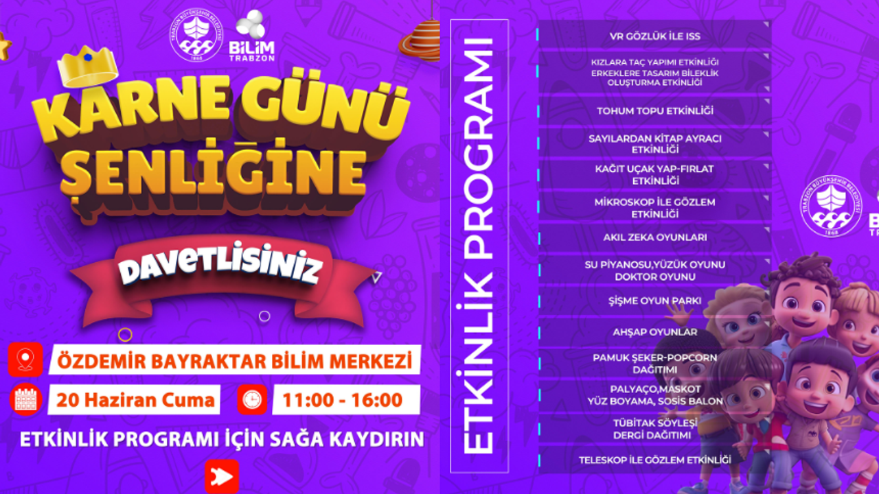 Trabzon Büyükşehir Belediyesi, karne gününü eğlenceye çeviriyor. Özdemir Bayraktar Bilim Merkezi'nde 20 Haziran Cuma günü 11.00-16.00 saatleri arasında çocuklar için bir dizi etkinlik düzenlenecek. Çocuklar karnelerini aldıktan sonra, bilim merkezinde düzenlenecek olan Karne Günü Şenliği’nde; VR gözlük (sanal gerçeklik gözlüğü), kızlara taç yapımı, erkeklere tasarım bileklik oluşturma etkinliği, tohum topu etkinliği, sayılardan kitap ayracı etkinliği, kağıt uçak yap-fırlat etkinliği, mikroskop ile gözlem etkinliği, akıl zeka oyunları, su piyanosu, yüzük oyunu, doktor oyunu, şişme oyun parkı, ahşap oyunlar, pamuk şeker-popcorn dağıtımı, palyaço, maskot, yüz boyama, sosis balon, TÜBİTAK söyleşi dergi dağıtımı ve teleskop ile gözlem etkinliği gibi aktivitelere katılabilecekler. Büyükşehir Belediyesi'nden yapılan açıklamada çocuklar etkinliklere davet edilerek, “Karneni al, eğlence ve bilim dolu bu özel günde bizimle ol. Tatlı sürprizlerle dopdolu bir gün seni bekliyor. Tüm çocuklarımızı ve ailelerini bu keyifli şenliğe bekliyoruz” ifadelerine yer verildi.