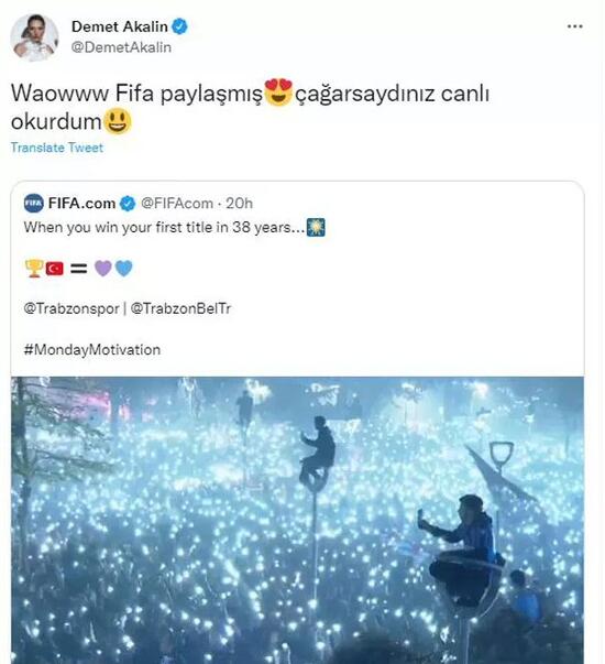 FIFA'nın resmi Twitter hesabı üzerinden Trabzonspor’un şampiyonluk kutlama görüntülerini, "38 yıl sonra ilk şampiyonluğunuzu kazandığınızda..." mesajıyla paylaşmasının ardından ünlü şarkıcı Demet Akalın da Twitter hesabından söz konusu tweet'i alıntılayarak bir paylaşımda bulundu.Paylaşılan görüntülerde Demet Akalın'ın seslendirdiği Kulüp şarkısının çalındığı kutlama anları yer alıyordu. Demet Akalın Twitter hesabından FIFA'nın paylaşımını alıntılayarak "Waow FIFA paylaşmış. Çağırsaydınız canlı okurdum" yorumunu yaptı. Akalın'ın paylaşımına çok sayıda beğeni, yorum ve retweet geldi.