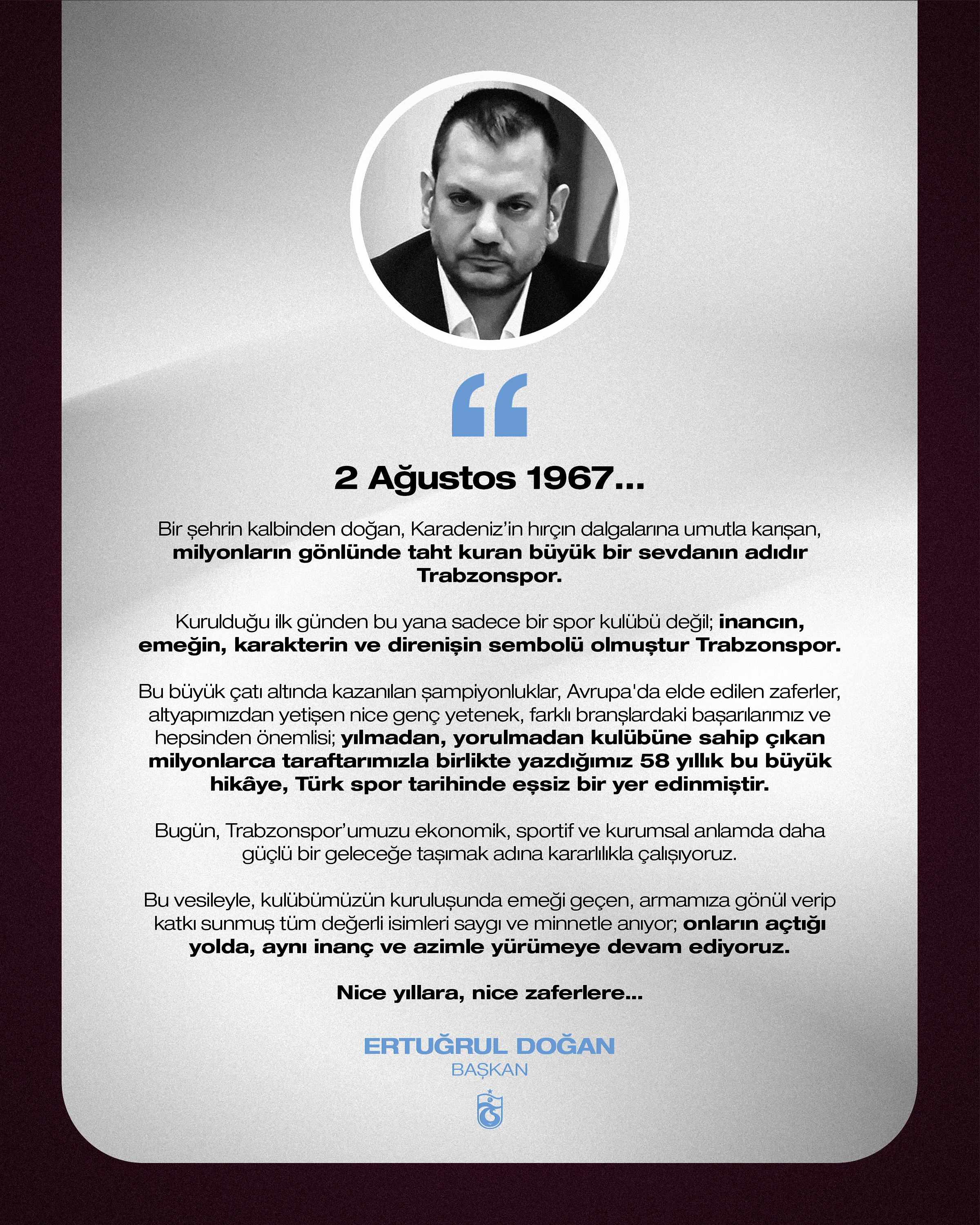 Başkan Doğan, mesajında Trabzonspor’un sadece bir spor kulübü değil, aynı zamanda inancın, emeğin ve direnişin sembolü olduğuna dikkat çekti.
