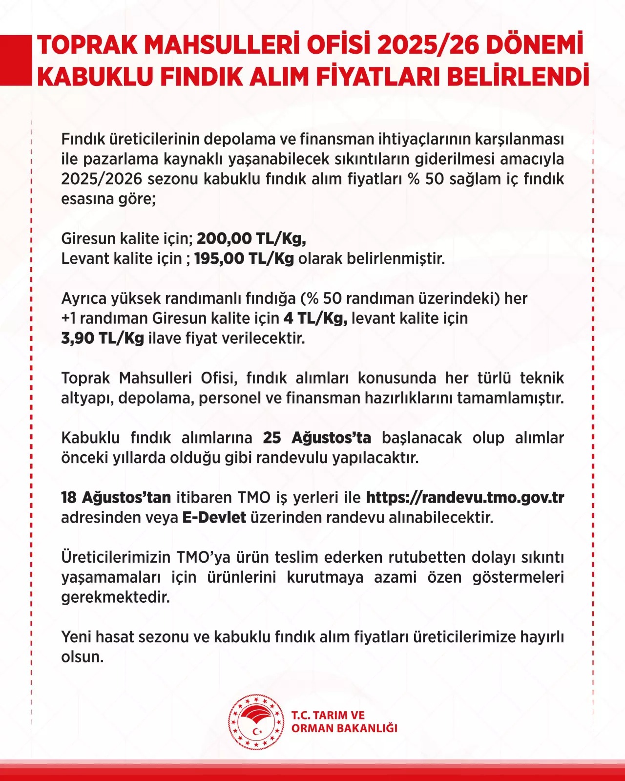 T.C. Tarım ve Orman Bakanlığı, 2025/26 üretim sezonuna ilişkin kabuklu fındık alım fiyatlarının Toprak Mahsulleri Ofisi (TMO) tarafından belirlendiğini duyurdu. Açıklama, Bakanlığın resmi sosyal medya hesabından yapıldı.