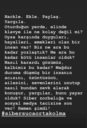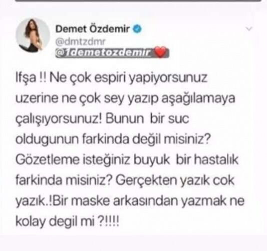 Demet Özdemir de bir paylaşım yaparak "Ne çok espri yapıyorsunuz üzerine ne çok şey yazıp aşağılamaya çalışıyorsunuz! Bunun bir suç olduğunun farkında değil misiniz?" dedi.