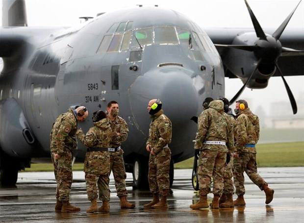 Salgın nedeniyle birçok tatbikatını iptal eden Amerikan ordusu, Japonya'daki Yokota Hava Üssü'nde yeni bir gövde gösterisine girişti. Bir C-130 nakliye uçağının önünde maskeli ABD askerleri görülüyor.