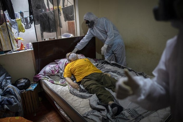 Venezuelalı cenaze evi çalışanı Luis Zerpa, başkent Lima'daki evinde intihar eden 68 yaşındaki Faustino Lopez'i ceset torbasına koymaya hazırlanıyor. Faustino Lopez, corona virüs testinin pozitif sonuç verdiğini öğrenince bir hastaneye başvurdu ancak görevliler tarafından geri çevrildi. Bunun üzerine evine dönüp tuz ruhu içti ve kendini astı.