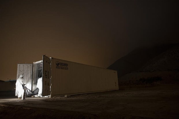 Başkent Lima'daki Hipolito Unanue devlet hastanesinde çalışanlar, cesetleri gece yarısı bahçedeki geçici morga taşıyor. Son bir haftada ortalama 4 bin vakanın kayıtlara geçtiği Peru'da, ortalama ölü sayısı da 100'ün üzerinde.