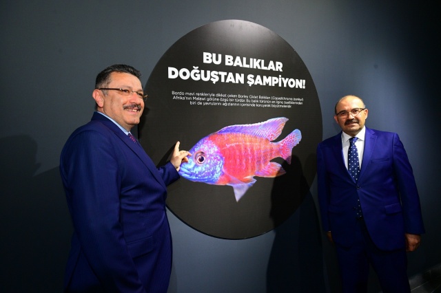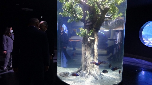 Konuşmaların ardından Tünel Akvaryum gezilirken, en çok ilgiyi bordo mavi renkli balıklar gördü.