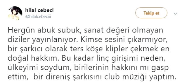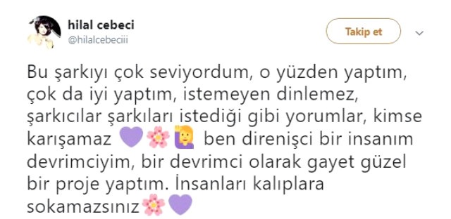 Hilal Cebeci gelen eleştiriler karşısında sosyal medya hesabından açıklamalarda bulunarak, "Bu şarkıyı çok seviyordum, o yüzden yaptım, çok da iyi yaptım, istemeyen dinlemez, şarkıcılar şarkıları istediği gibi yorumlar, kimse karışamaz. Ben direnişci bir insanım devrimciyim, bir devrimci olarak gayet güzel bir proje yaptım. İnsanları kalıplara sokamazsınız." yorumunu yaptı.
