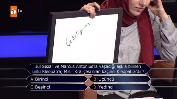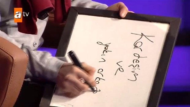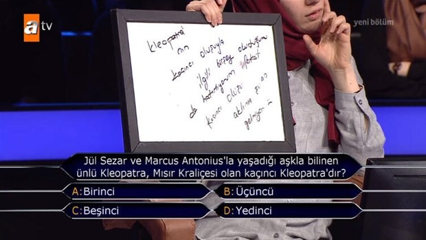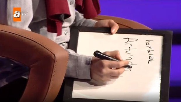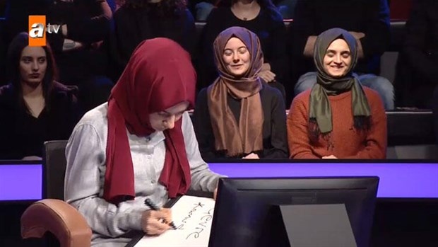 Yarışma sunucusu Kenan İmirzalıoğlu soruları sordu ve yarışmacı kendisine özel hazırlanan yazı tahtasından soruları cevapladı.