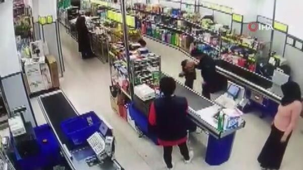 Diğer kadın marketten ayrılırken, olay anı saniye saniye güvenlik kamerasına yansıdı.