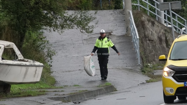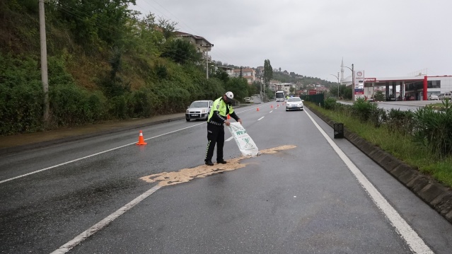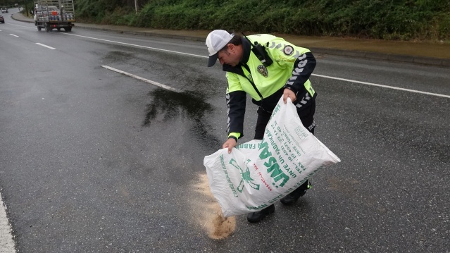 Ters dönen otomobilden karayoluna sızan motor yağı için trafik polisleri yoğun çaba gösterdi. Bir trafik polisi tek şerite düşen ulaşım için sürücüleri uyarırken, diğer trafik polisi ise yola sızan yağ için talaş ve toprak arayışına geçti.