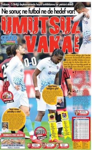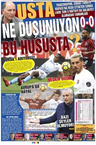 Taka Gazetesi, “Usta ne düşünüyon bu hususta?”, “Trabzonspor, Ziraat Türkiye Kupası’na veda ettikten sonra ligde son 5 haftayı da galibiyet alamadan tamamladı” yorumunu yaptı.