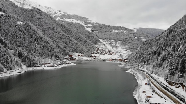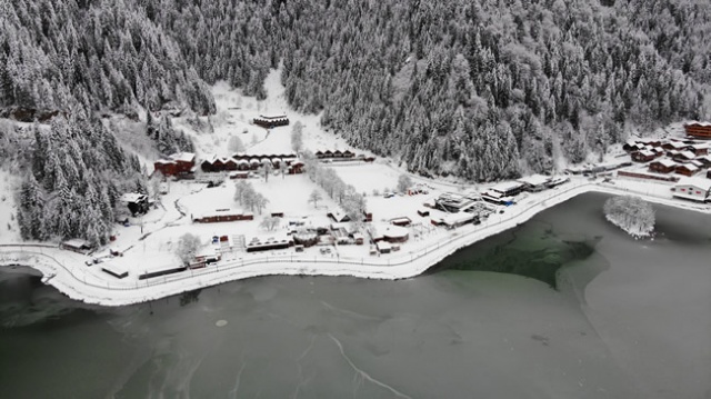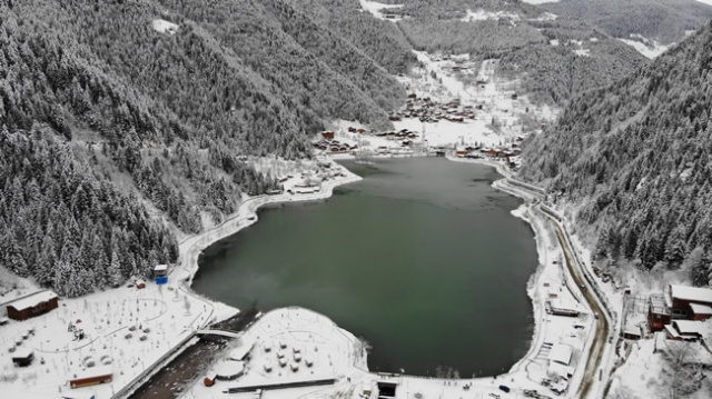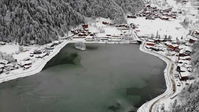 Hava sıcaklığının sıfırın altına düşmesi ile gölde donma gözlenirken, beyaz görüntüsüyle seyrine doyumsuz eşsiz manzaralar oluşturan Uzungöl havadan görüntülendi.