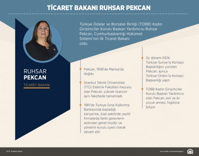Türkiye Odalar ve Borsalar Birliği (TOBB) Kadın Girişimciler Kurulu Başkan Yardımcısı Ruhsar Pekcan, Cumhurbaşkanlığı Hükümet Sistemi'nin ilk Ticaret Bakanı oldu.