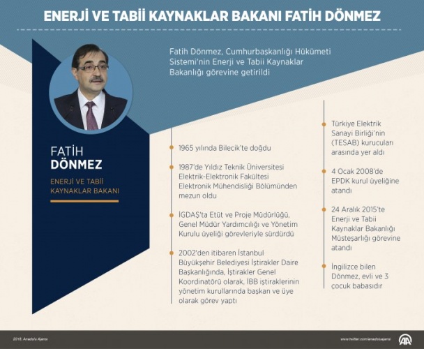 Fatih Dönmez, Cumhurbaşkanlığı Hükümeti Sistemi'nin Enerji ve Tabii Kaynaklar Bakanlığı görevine getirildi.
