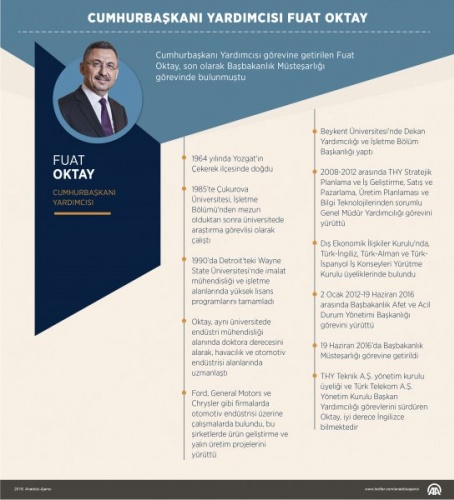 Türkiye Cumhurbaşkanı Recep Tayyip Erdoğan'ın açıkladığı kabinede Cumhurbaşkanı Yardımcısı görevine getirilen Fuat Oktay, son olarak Başbakanlık Müsteşarlığı görevinde bulunmuştu.