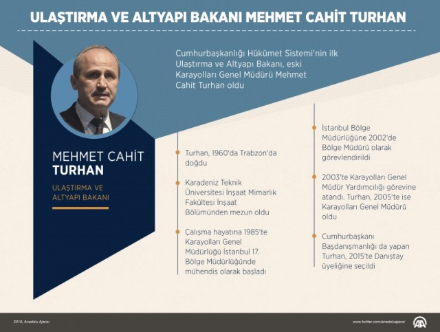 Cumhurbaşkanlığı Hükümet Sistemi'nin ilk Ulaştırma ve Altyapı Bakanı, eski Karayolları Genel Müdürü Mehmet Cahit Turhan oldu.