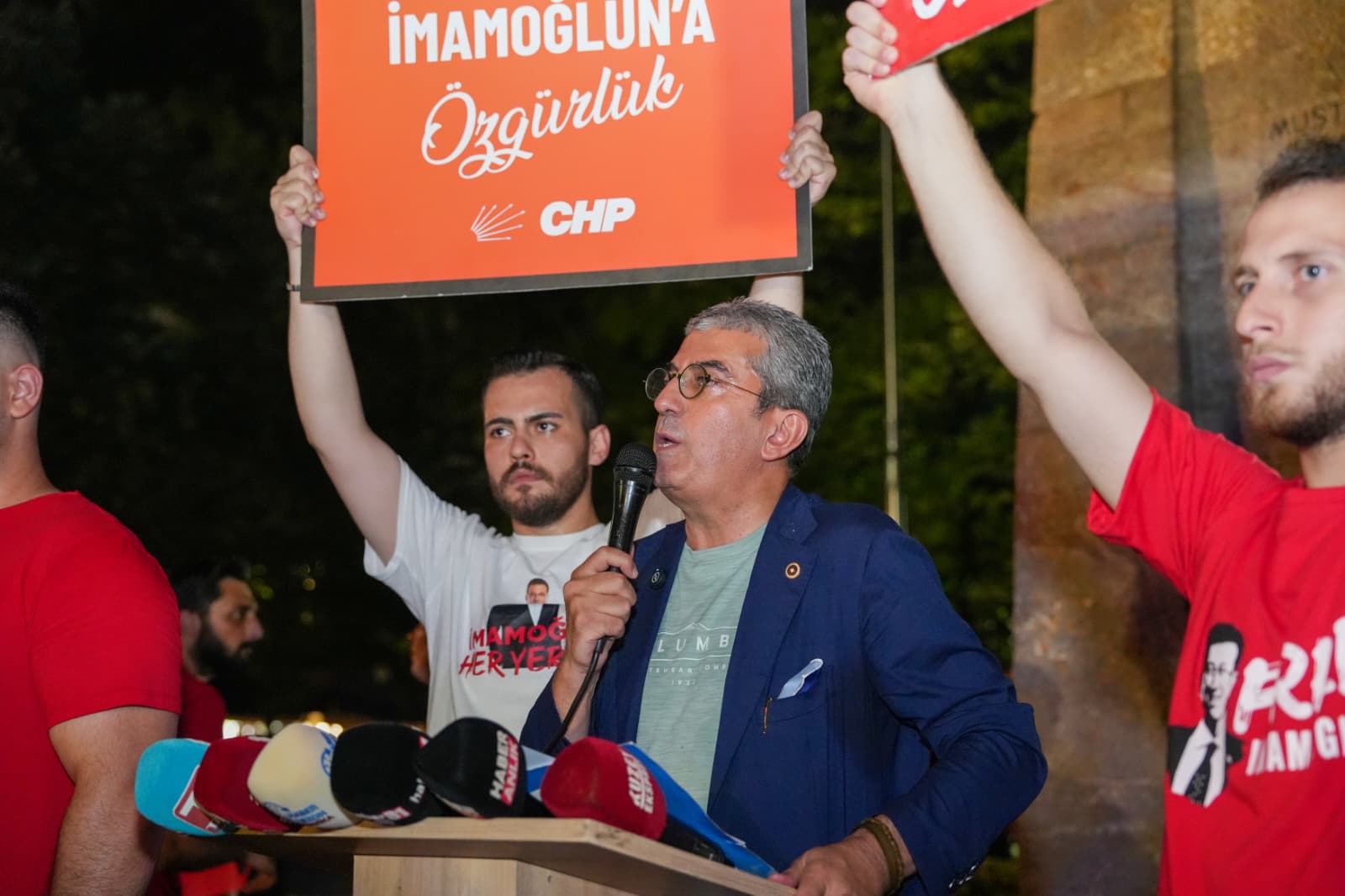 Can Yücel’in ‘Denizler İçin’ isimli şiirini okuyarak konuşmasına başlayan CHP Grup Başkanvekili Gökhan Günaydın, “Sevgili Can Yücel şöyle diyor; ‘Dün caddede uzun bir maratonsa devrim, sen en hızlı 100 metresini koştun. Ama aşk olsun sana çocuk, aşk olsun.’ Evet, bu Denizler için yazıldı ama şunu biliyoruz ki, Ekrem başkan da bu memlekette özgürlüğe ve adalete giden yolda en hızlı 100 metreyi koştu. Aşk olsun sana Ekrem başkan, aşk olsun! 18 Mart günü 35 yıllık diploması iptal edildiğinde, gece evinde beraberdik. Ve yarın sabah bir şeylerin olabileceğine ilişkin derin bir kaygı vardı içimizde. Ama aynı zamanda, güler yüzlü bir kararlılıkla beraberdik. 19 Mart sabahı saat 6’yı 5 geçe telefonum çaldı ve Ekrem başkan dedi ki, “Gökhan sonunda bu da oldu. 200 polis kapımdaymış.” “Başkanım 10 dakika sonra oradayım, benim orada olmamın bir önemi yok millet yanında” dedim. Dışarıda onu almaya gelenler beklerken, kravatını bağlama konuşmasını hepimiz hatırlıyoruz. O, “Bize yenilmeyi öğretemeyecekler!” dedi. Öğretemediler değil mi, öğretemediler” dedi.