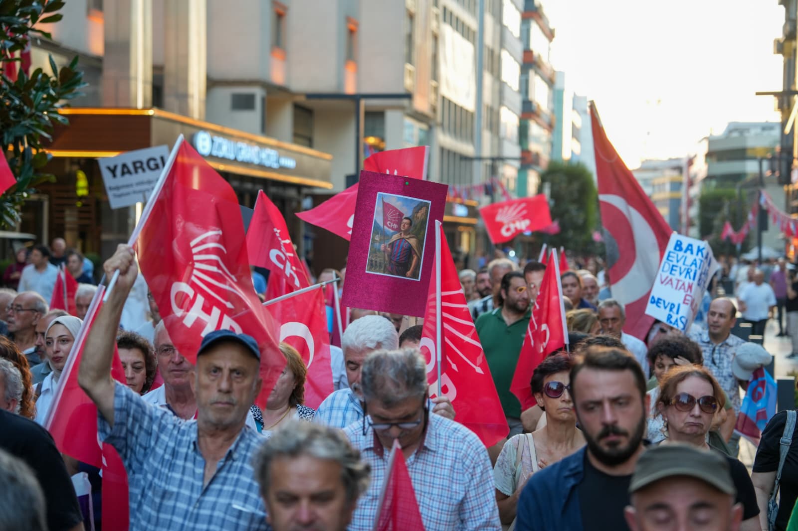 “Hak, hukuk, adalet”, “Kurtuluş yok tek başına ya hep beraber ya hiçbirimiz”, “Cumhurbaşkanı İmamoğlu”, “Murat Çalık gururumuzdur”, “Direne direne kazanacağız” sloganlarının atıldığı yürüyüş sonrasında, konuşmalar yapıldı.
