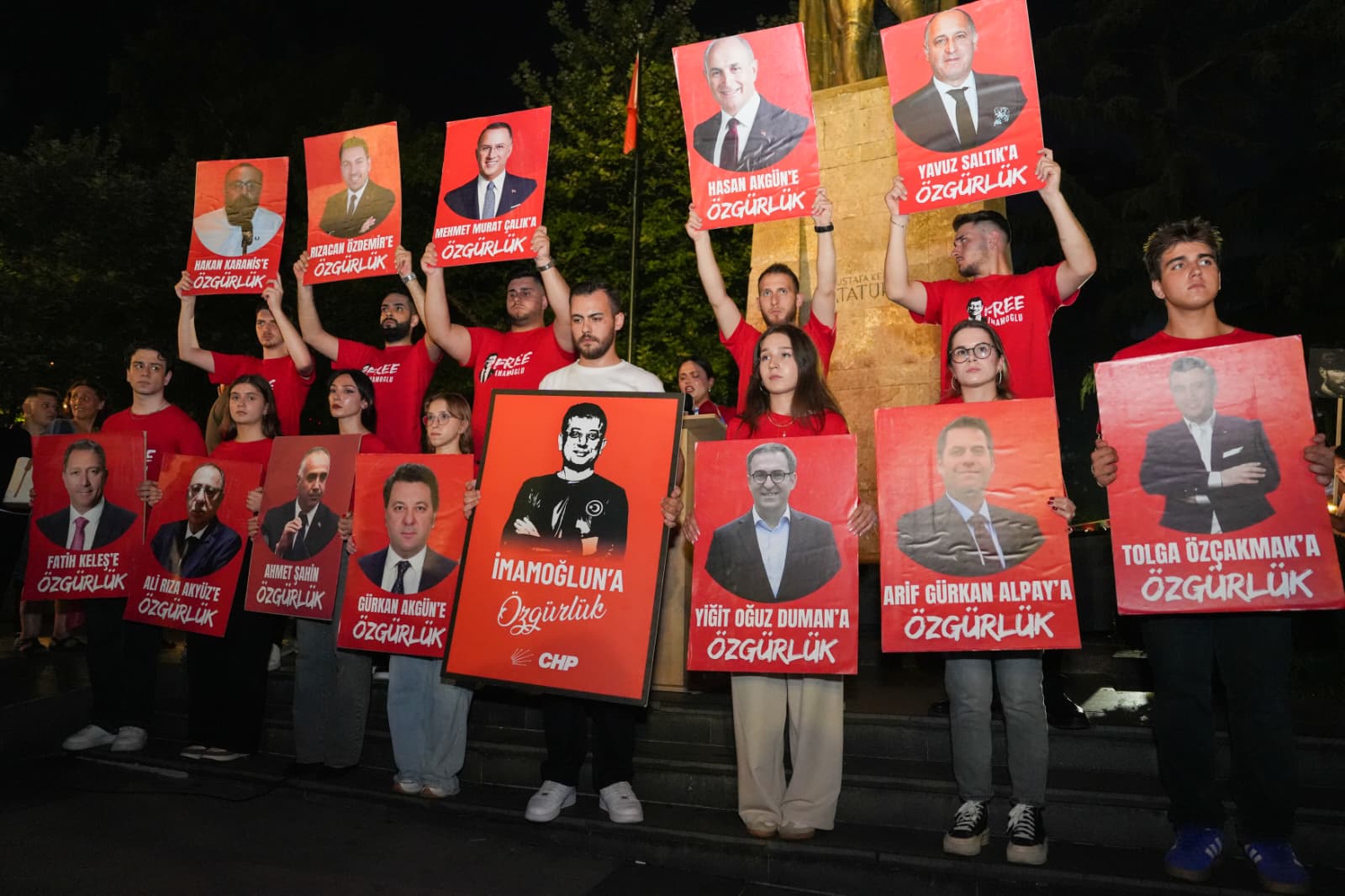 CHP Gençlik Kolları üyeleri, 19 Mart operasyonlarında tutuklanan Ekrem İmamoğlu, Mehmet Murat Çalık, Hasan Akgün, Fatih Keleş, Ali Rıza Akyüz, Ahmet Şahin, Gürkan Akgün, Yiğit Oğuz Duman, Arif Gürkan Alpay, Tuncay Tolga Özçakmak, Hakan Karanis, Rıza Can Özdemir ve Yavuz Saltık’ın fotoğraflarının bulunduğu dövizlerle alana gelerek özgürlük çağrısı yaptı.
