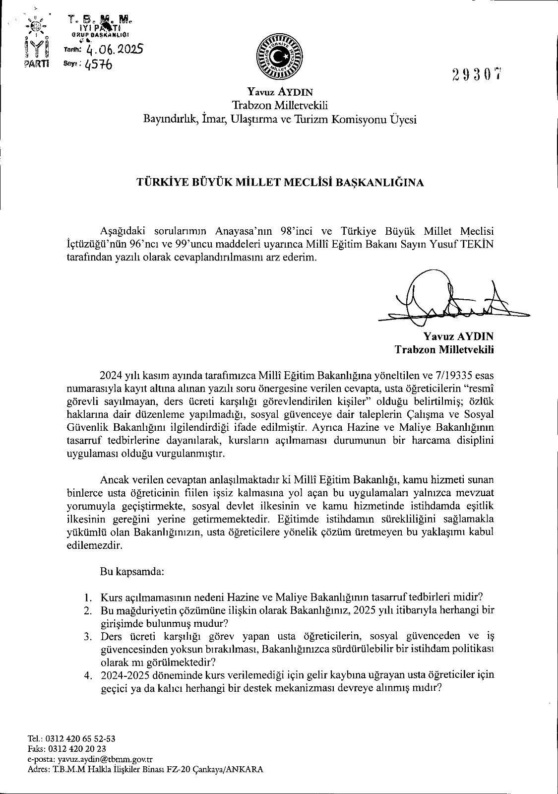 2024 Kasım ayında Bakanlığa yöneltilen önceki bir önergeye verilen cevapta, usta öğreticilerin “resmî görevli sayılmadığı” ve “tasarruf tedbirleri kapsamında kursların açılmadığı” yönünde açıklamalar yapıldığını hatırlatan Aydın, “Bu yaklaşım, sosyal devlet ilkesini ve kamu hizmetinde eşitlik anlayışını açıkça ihlal etmektedir. Eğitim gibi kamusal bir alanda, güvencesiz ve mevsimlik bir istihdam modelinin sürdürülmesi kabul edilemez.” ifadelerini kullandı.