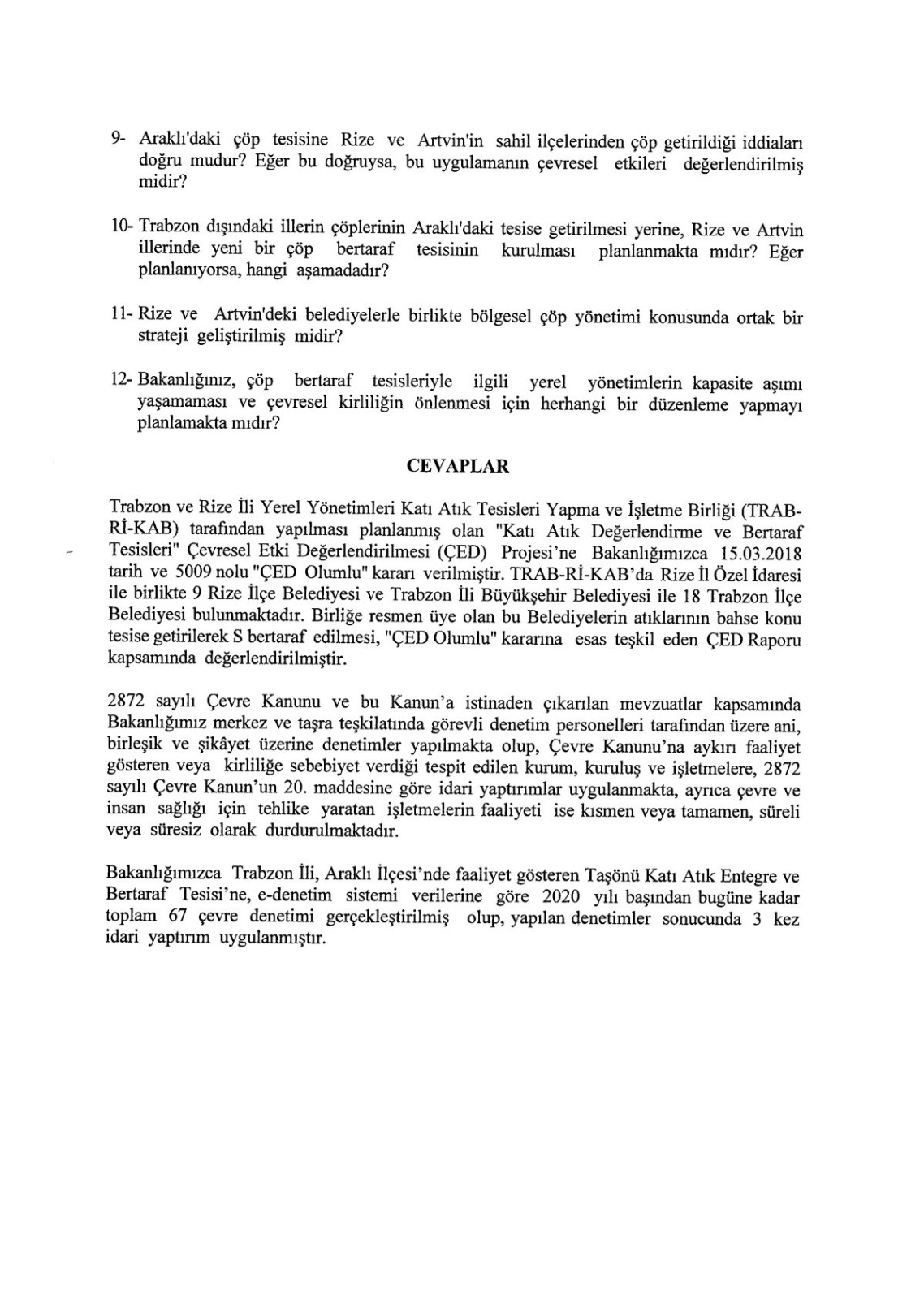 Bakanlık, soruların hiçbirine doğrudan ve doyurucu bir cevap vermemiştir. Yanıtlar; sadece “2018’de ÇED olumlu raporu verilmiştir” ve “Bugüne kadar 67 denetim yapılmış, 3 kez idari yaptırım uygulanmıştır” şeklindeki klişe bilgilerle sınırlı kalmıştır. Ne koku sorunu ne kapasite aşımı ne de çevre riskleriyle ilgili tek bir açıklama yapılmamıştır.