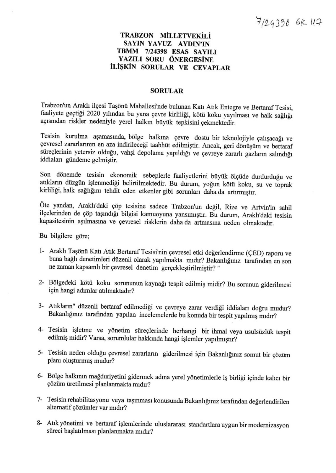 Trabzon’un Araklı ilçesi Taşönü Mahallesi’nde 2020 yılında faaliyete geçen Katı Atık Entegre ve Bertaraf Tesisi; yalnızca çevreyi değil halk sağlığını da tehdit eden, kötü yönetimin somut bir örneğine dönüşmüştür. Bölge halkının yaşam kalitesini düşüren bu tesis hakkında kamuoyunu bilgilendirmek ve somut sorunlara çözüm bulmak amacıyla Çevre, Şehircilik ve İklim Değişikliği Bakanı Sayın Murat Kurum’a 12 maddelik bir yazılı soru önergesi sunduk.