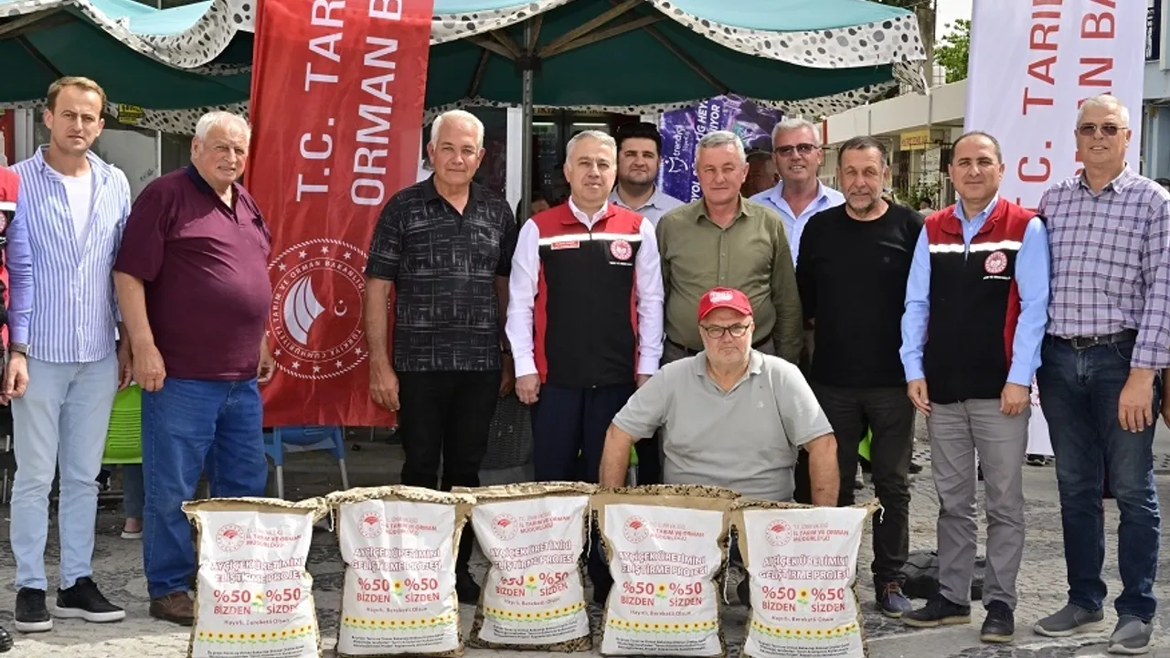 İzmir Tarım ve Orman İl Müdürlüğü tarafından yürütülen “Tarım Arazilerinin Kullanımının Etkinleştirilmesi Projesi’ kapsamında “Ayçiçeği Üretimi Geliştirme Projesi” ile yerli ve hibrit ayçiçeği tohumları üreticilere teslim edildi.İZMİR (İGFA) - İzmir'in Menemen ilçesi Seyrek Mahallesi'nde düzenlenen etkinlikle Menemen, Aliağa ve Çiğli’de ayçiçeği üretimi gerçekleştiren 45 üreticiye toplamda 2.125 dekar alanda ekimi gerçekleştirilmek üzere 85 torba TR 2242 CL yerli hibrit ayçiçeği tohumu teslim edildi.