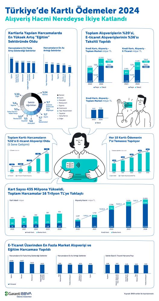 Garanti BBVA Ödeme Sistemleri’nin (GÖSAŞ) BKM verilerini temel alarak gerçekleştirdiği ‘Türkiye’de Kartlı Ödemeler 2024’ çalışmasının sonuçları açıklandı. GÖSAŞ’ın verilerden yola çıkarak hazırladığı infografik, Türkiye’de geçtiğimiz yıl banka ve kredi kartı sahipliği, kartlı harcamalardaki trendler ve e-ticaret alanındaki büyüme oranları hakkında bilgi veriyor.