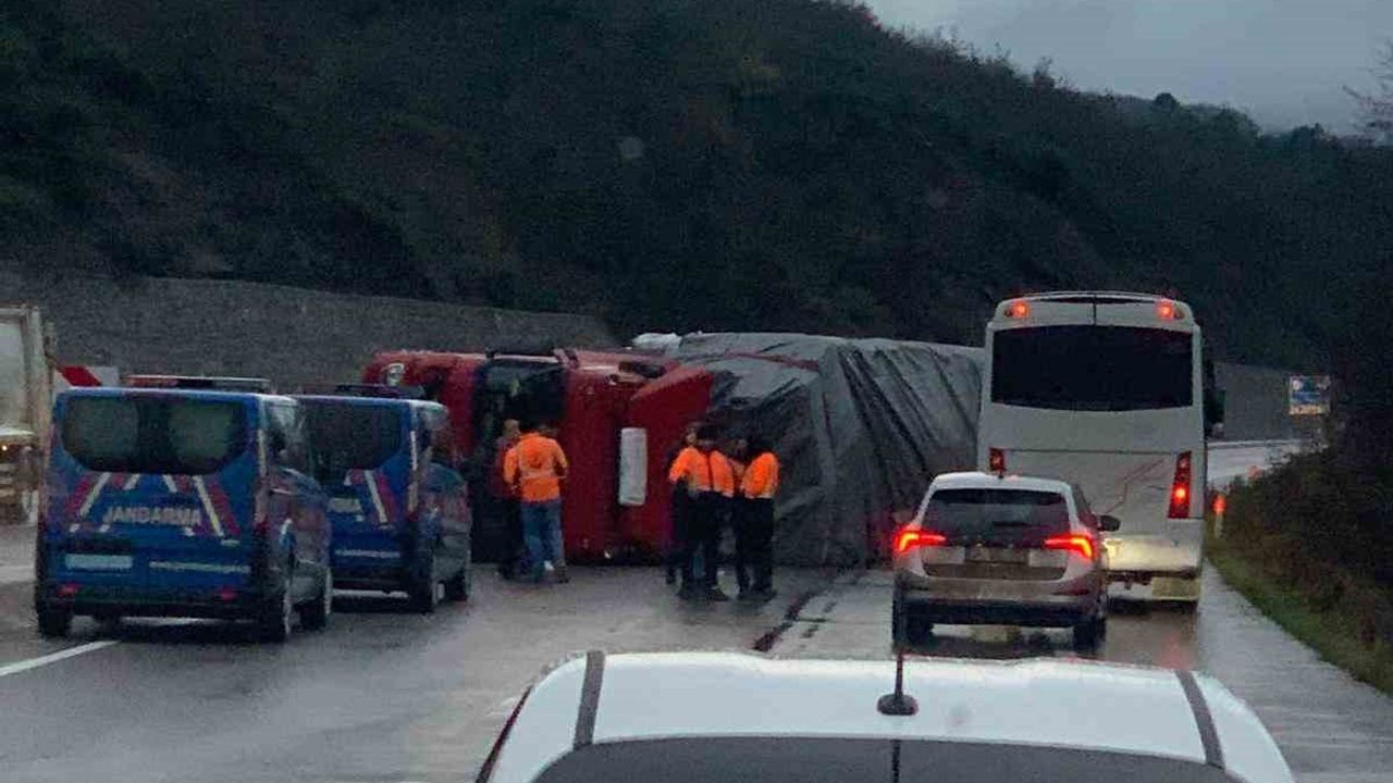 Zonguldak-Ankara kara yolunda sürücüsünün kontrolünden çıkan tır yan yattı.