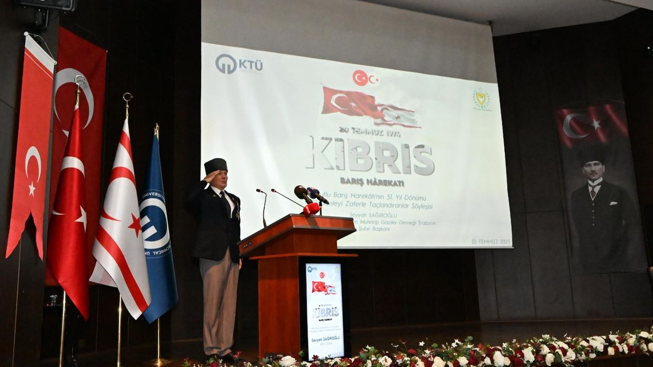 Programın açılış konuşmasını yapan KTÜ Rektörü Prof. Dr. Hamdullah Çuvalcı, Kıbrıs Barış Harekâtı’nın milli iradenin ve uluslararası hukukun sınandığı kritik bir süreç olduğuna dikkat çekerek şunları söyledi: “20 Temmuz 1974, yalnızca bir askeri harekâtın tarihi değil, aynı zamanda barışın, özgürlüğün ve insanlık onurunun yeniden tesisi anlamına gelen bir milattır. Bu harekât, bütün dünyaya güçlü bir mesaj vermiştir: ‘Kıbrıs Türkü‘ asla yalnız değildir!”